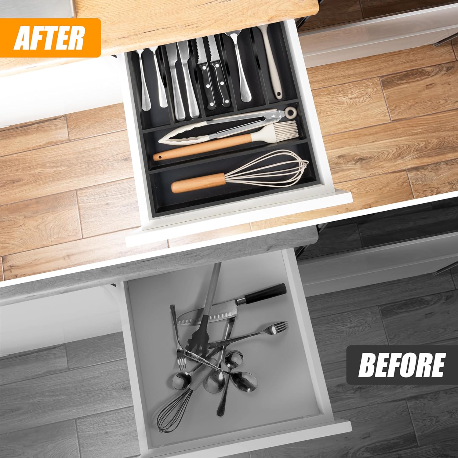 - ✅【Deep Compartments & Reinforced Base】Our utensil drawer organizer features compartments with a depth of 1.9 inches, helping maximize drawer space and perfect for storing more essential tools and gadgets. The utensil silverware drawer organizer flatware cutlery tray comes with a reinforced base, ensuring durability for long-term use, and is ideal for supporting the weight of heavy-duty utensils and knives. Keep everything you need conveniently at hand while cooking, neatly visible, and easy to grasp when preparing the next meal in the kitchen.