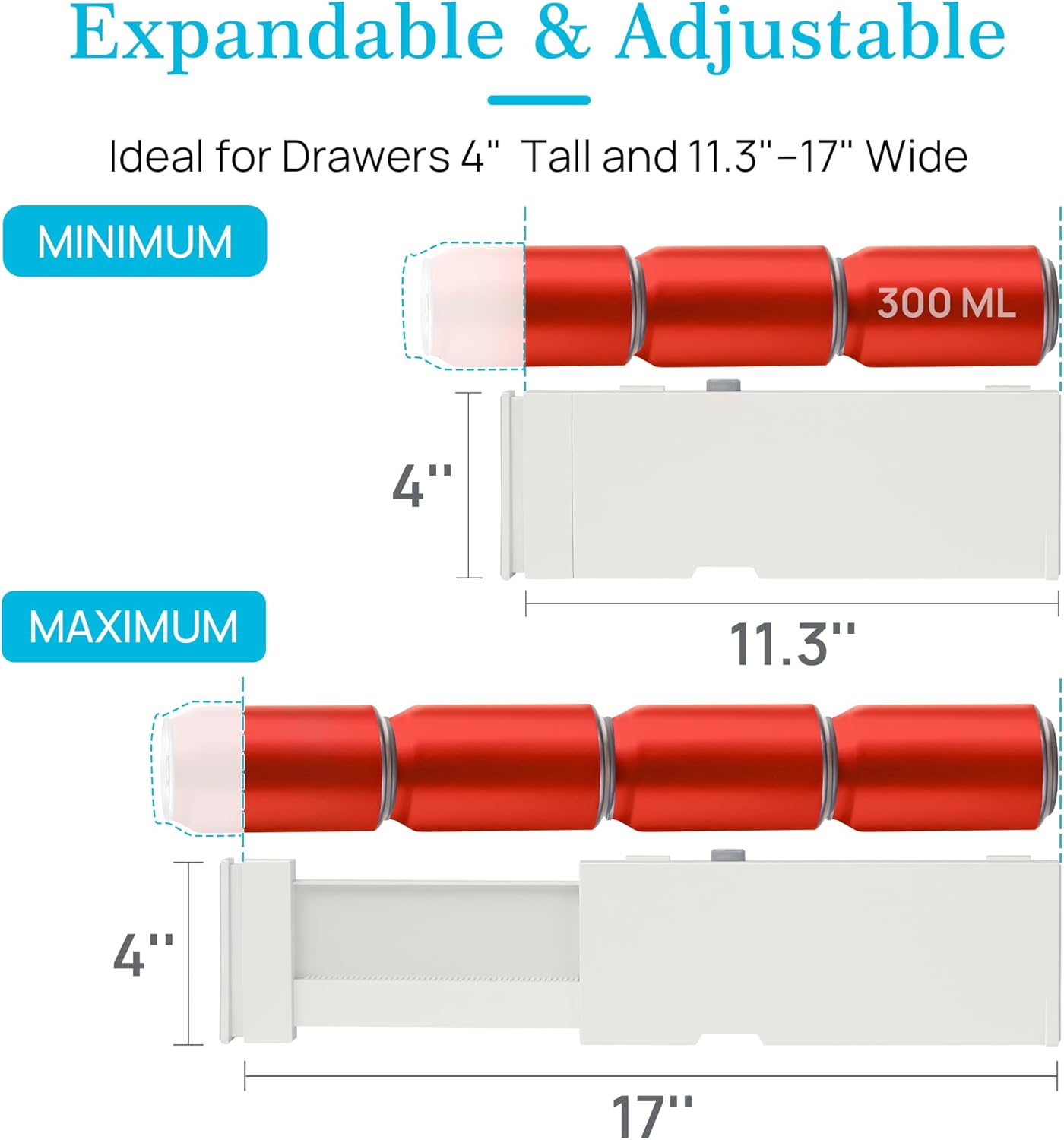 - Expandable & Adjustable---Each drawer divider for clothes can expandable from 11.6" to 17", 4"High and with a width of 1.1", our drawer dividers can be easily fitted into most drawers and cabinets, helping you organize your items and keeping your drawers tidy all the times.
