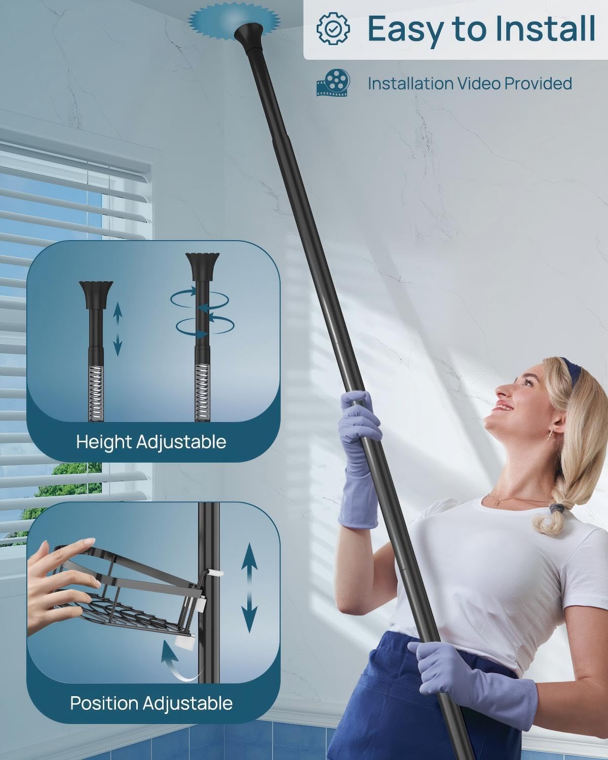 - [Rust-Proof Confidence]: Eliminate rust headaches with our black shower caddy! Built to resist corrosion, it ensures both poles and shelves remain rust-free, ensuring long-lasting durability. Whether it's for your bathroom, college dorm, or beside your vanity, this reliable shower storage for inside shower promises enduring organization and effortless accessibility