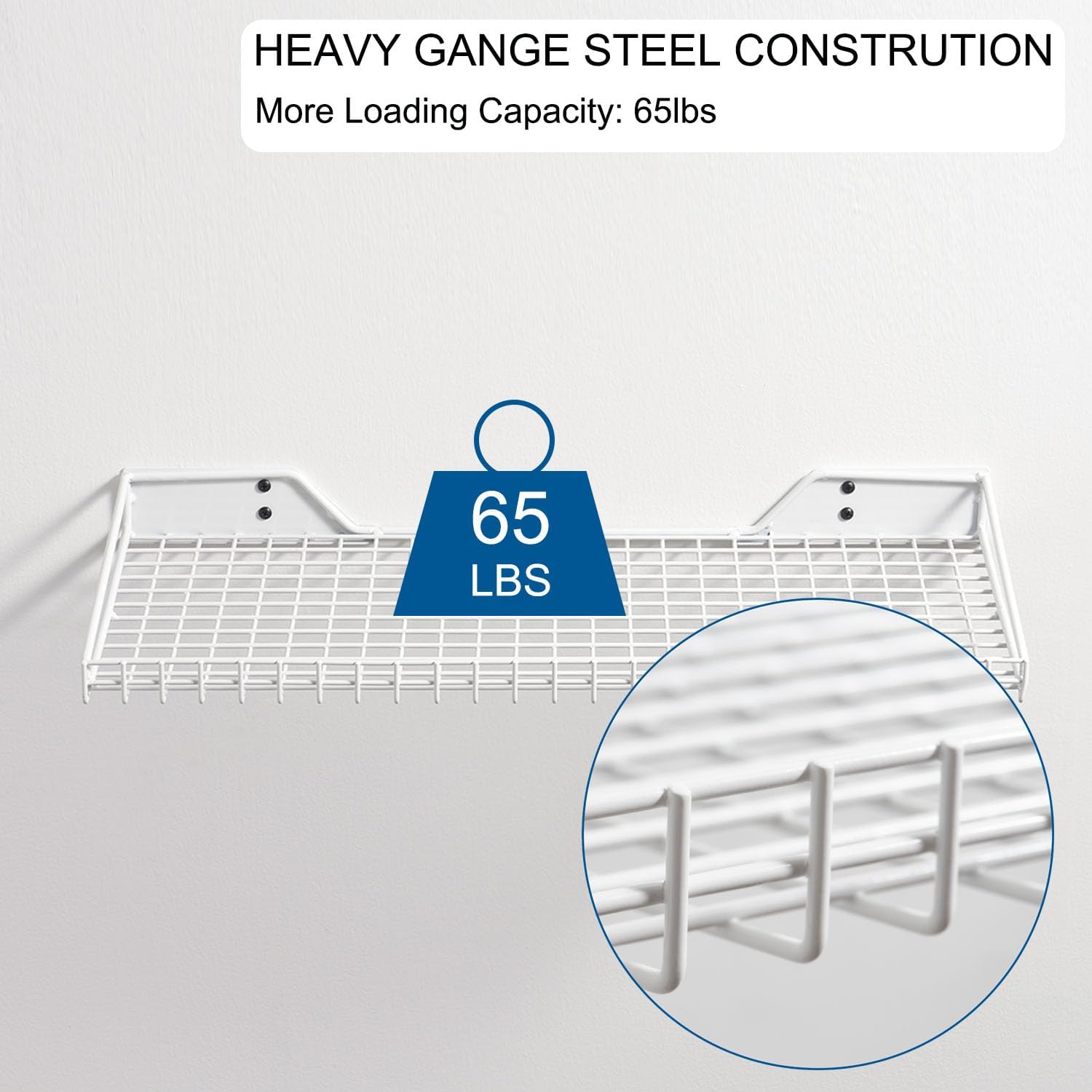 - HEAVY DUTY WALL SHELVES : Heavy compact steel metal and solid construction lend superb durability to the wire shelf wall mount. With plenty of load-earing testing, each wall storage shelf can hold up to 65 lbs and is built to last.