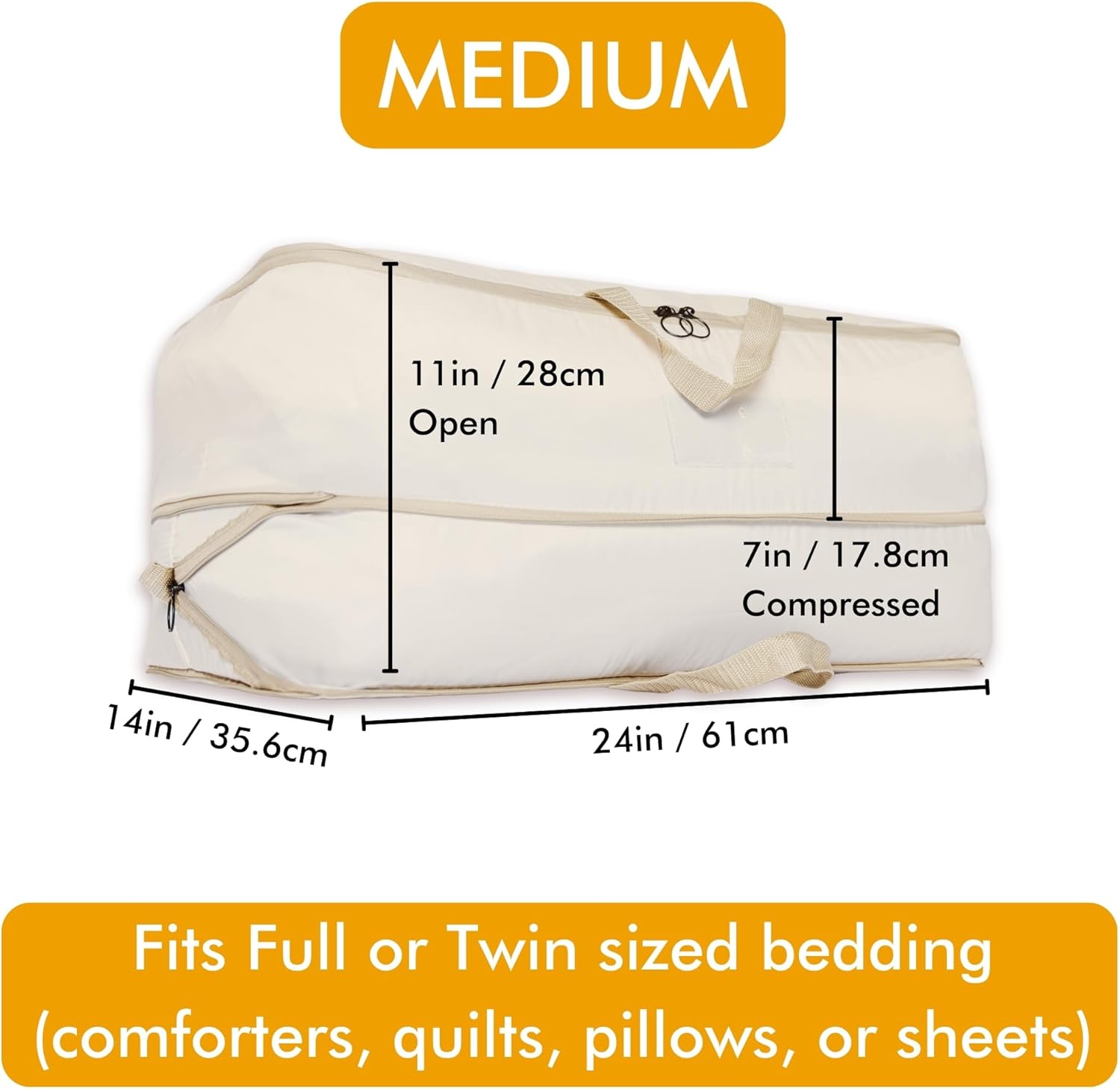- MULTIPLE SIZE OPTIONS: The comforter storage bag comes in different sizes to fit different types of bedding. It's available in medium (fits full/twin) and large (fits queen/king) sizes. It is a 2-pack and has multiple combinations. The Large Bag is 28x20x11" and the Medium Bag is 24x14x11". Both compress down to 7 inches.