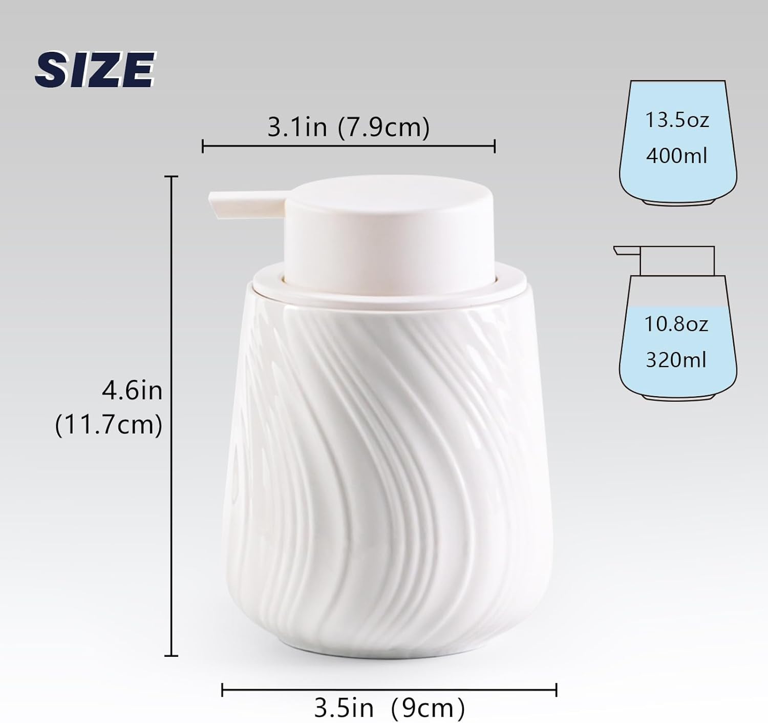 - Soap Dispenser Size:The hand soap dispenser measures 3.5in/9cm*4.6in/11.7cm and can hold 10.8oz/320ml of liquid.