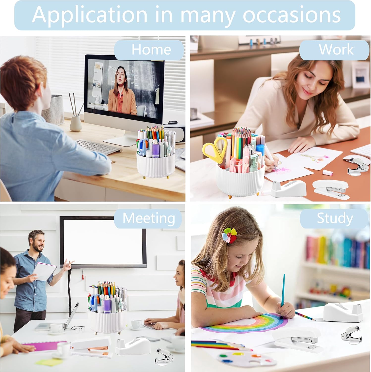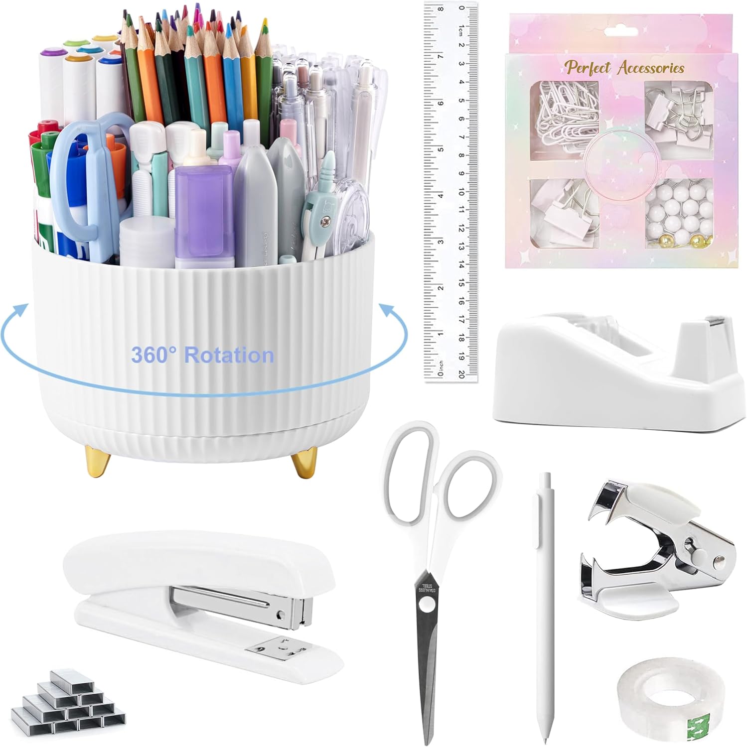 Office Desk Accessories, White Office Supplies 360°Pen Holder Desk Organizers And Accessories with Tape Dispenser, Stapler, Staple Remover, 1000 Staples, Tape, Clips Set, Ruler, Scissor, Pen