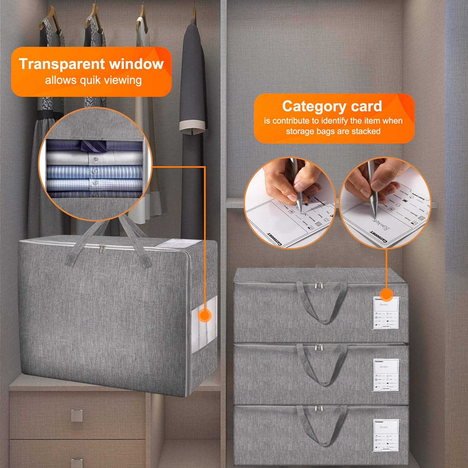 - 【Clear Window & Category Card】The bedding storage bags for comforters and blankets has a clear window which allows quick viewing. Specially, each storage bag comes with one category card, categories include: comforters/duvets/pillows/blankets/clothes/sheets/toys/baby items, or you can fill in the category in the blank of top card.
