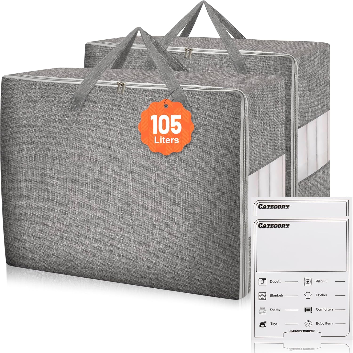 2 Pack 105L Comforter Storage Bags, Extra Large Bedding Storage Bags with Category Card and Clear Window, Reinforced Handles & Zippers, Foldable Closet Organizers for Blanket Pillow