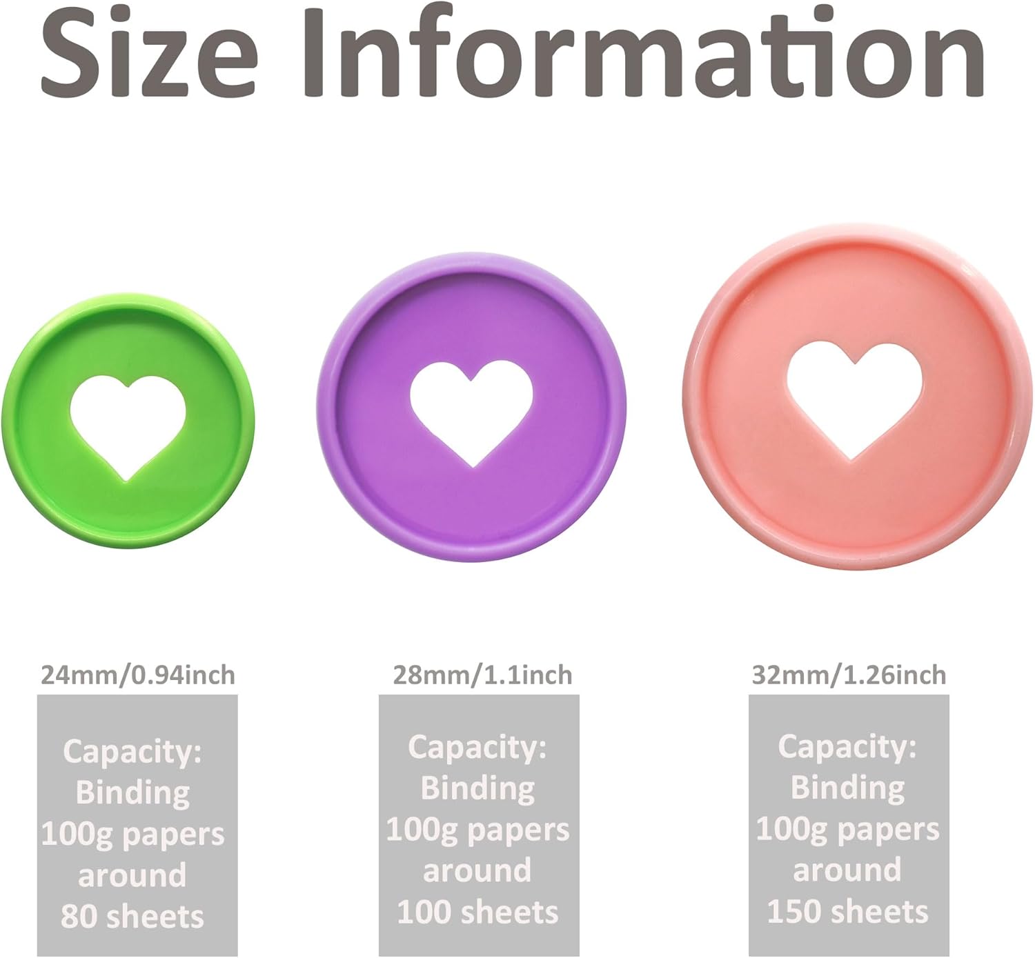- Dimensions: 0.94 inch(24mm) holds 80 sheets/1.1inch(28mm) holds 100sheets/1.26inch(32mm) holds 150sheets.Our heart discs are compatible with popular discbound notebook systems,discbound planner accessories and covers.