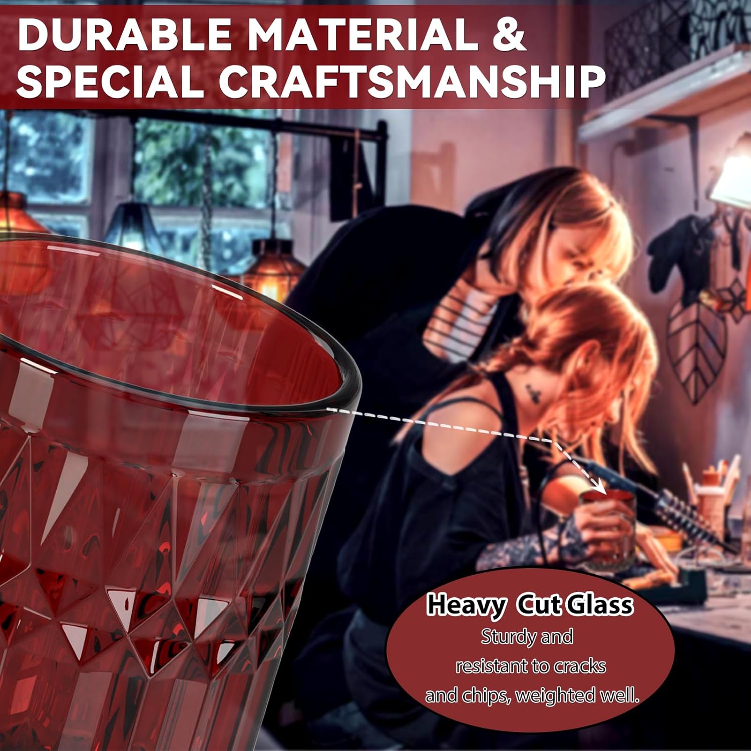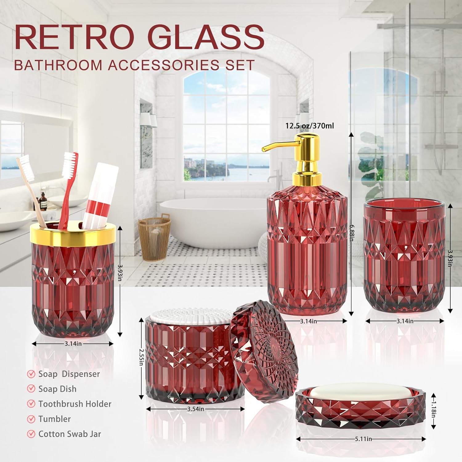 - 【DURABLE HEAVY CUT GLASS BATHROOM SETS】Unlike other fragile ceramic and inferior plastic bathroom accessories on the market, this red bathroom accessories are made from high-quality glass material, which is sturdy and resistant to cracks and chips, even with daily use. It also has an easy-to-clean surface, making it simple to maintain and keep looking like new.
