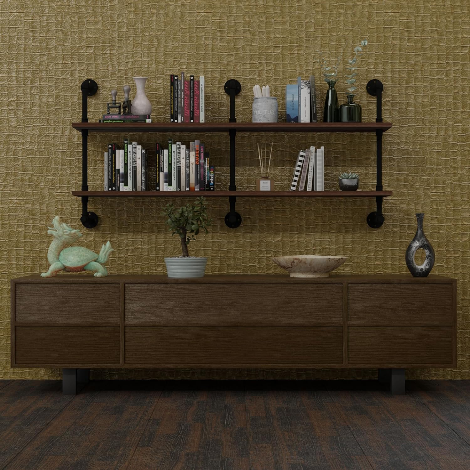 Industrial Pipe Wall Shelves Pipe Shelving with Real Wood Plank ,60 Inches Floating Shelves for Wall Farmhouse Pipe Book Shelves Dark Brown 2 Tier for Kitchen,Living Room Decor and Bar Shelving