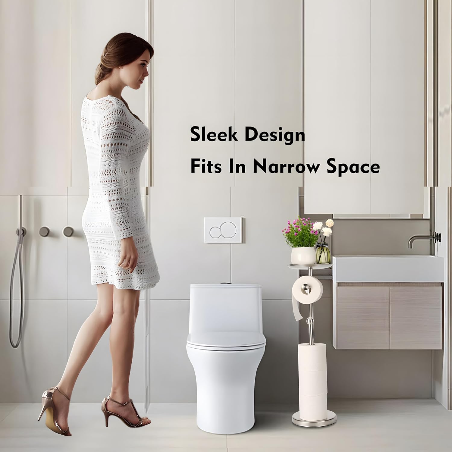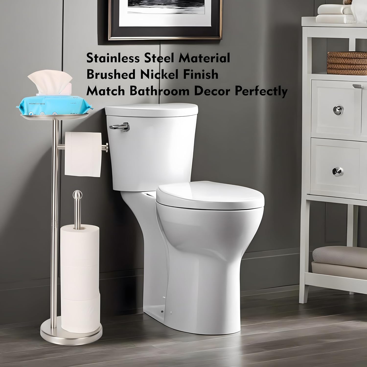 - This is cool, beautiful, and functional toilet paper holder, boasting a three-in-one design, which are the toilet paper rolls storage, the toilet paper roll dispensing post, and a big stainless steel tray / shelf at the top. Made of sturdy stainless steel with a brushed nickel finish, this toilet paper holder stand is a classy addition to any bathroom.