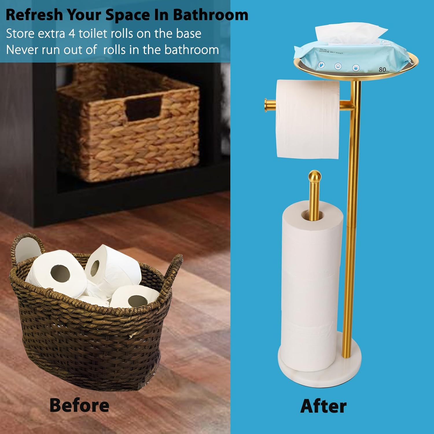 Noonext Gold Toilet Paper Holder Stand with Shelf, Heavy Marble Base No Tipping Over, Freestanding Toilet Paper Holder(Gold)
