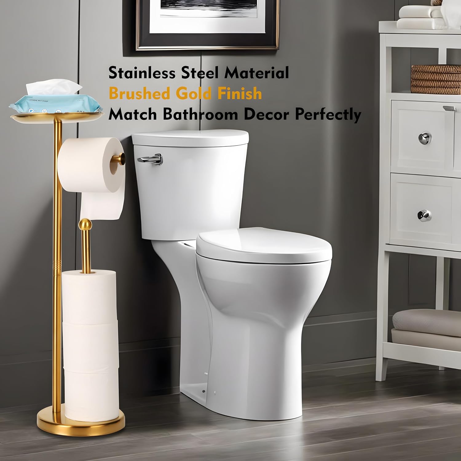 - This is cool, beautiful, and functional toilet paper holder, boasting a three-in-one design, which are the toilet paper rolls storage, the toilet paper roll dispensing post, and a big stainless steel tray / shelf at the top. Made of sturdy stainless steel with a brushed gold finish, this toilet paper holder stand is a classy addition to any bathroom.