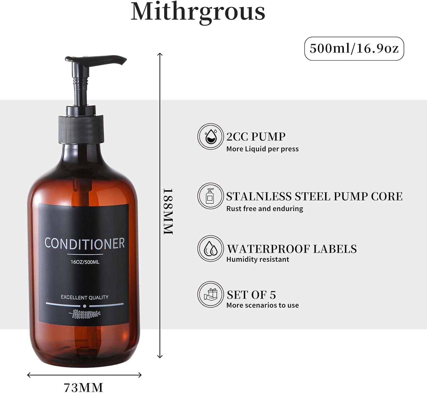 5Pack Amber Shower Bottles Refillable with Labels,16.9oz(500ml) Reusable Shampoo and Conditioner Bottles,Shampoo Dispenser Bottles