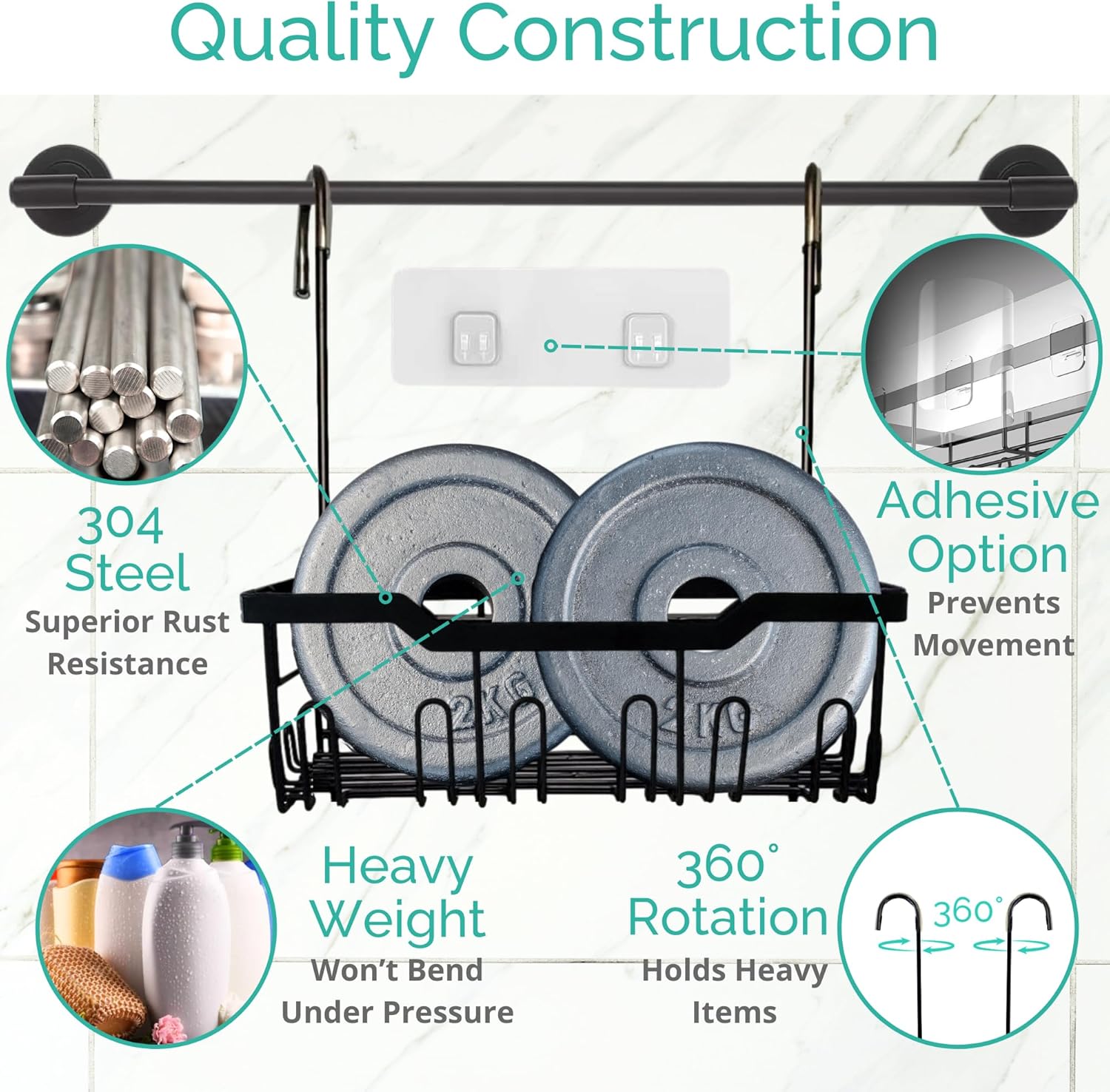 Heavy-Duty Black Hanging Shower Caddy with Rotatable Hooks and Adhesives - Rust-Proof 304 Stainless Steel - Bathroom Caddy for Organizing Your Shower Essentials