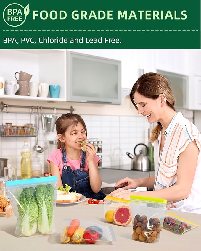 - LEAKPROOF & AIRTIGHT: These reusable bags will give you absolute confidence to hold liquids or sauces. Because they are 100% leakproof. The double-seal design keeps liquids and air locked inside,Perfect for storing and preserving food.With an anti-slip opening design, everyone can easily open and close the reusable freezer bags.