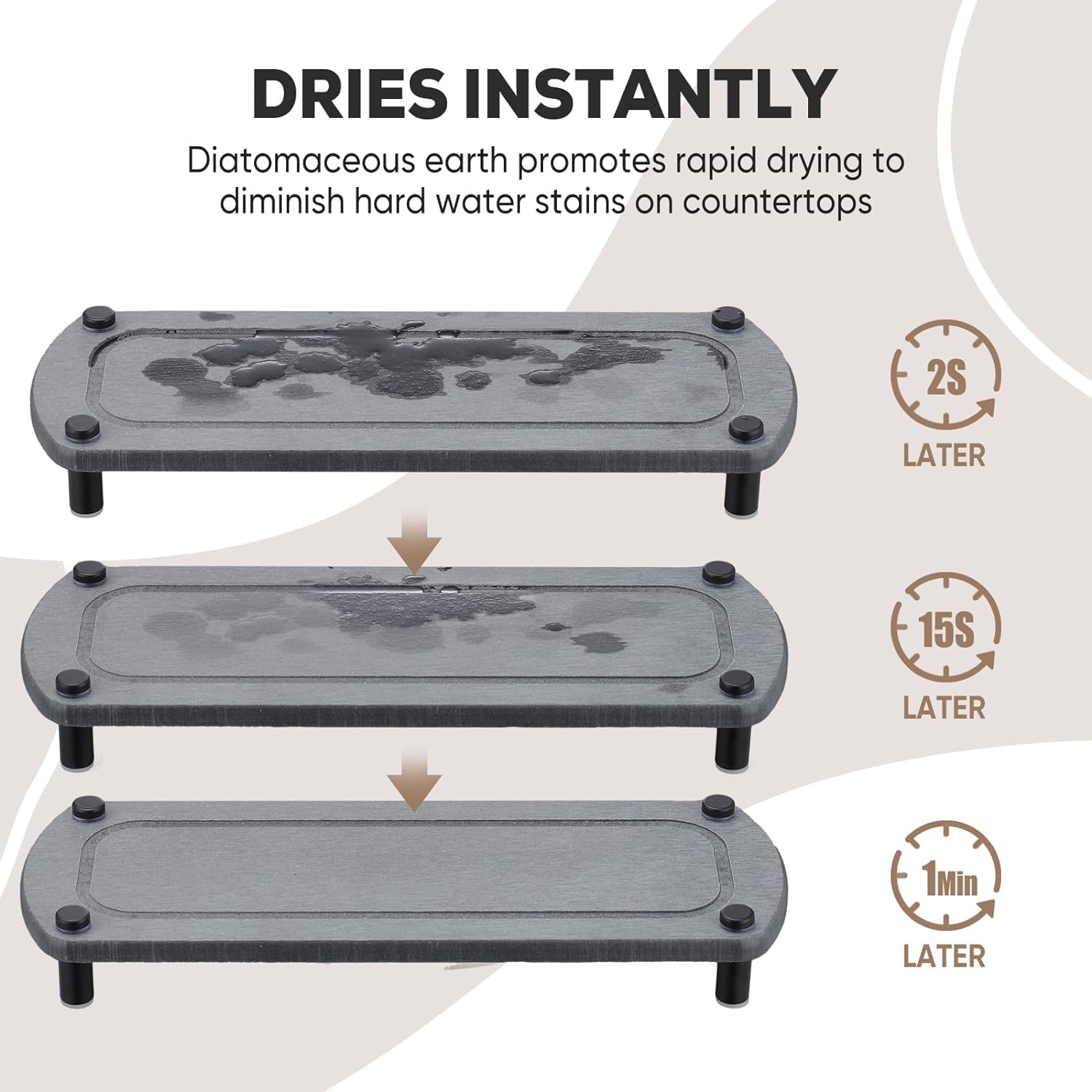 - INSTANT DRY SINK TRAY: Made of diatomaceous earth with amazing water absorbency, quickly absorbs excess water to keep your kitchen and bathroom countertops dry and clean. And it is easy to install and anti-slip effect.Size:11x4x1.2 IN