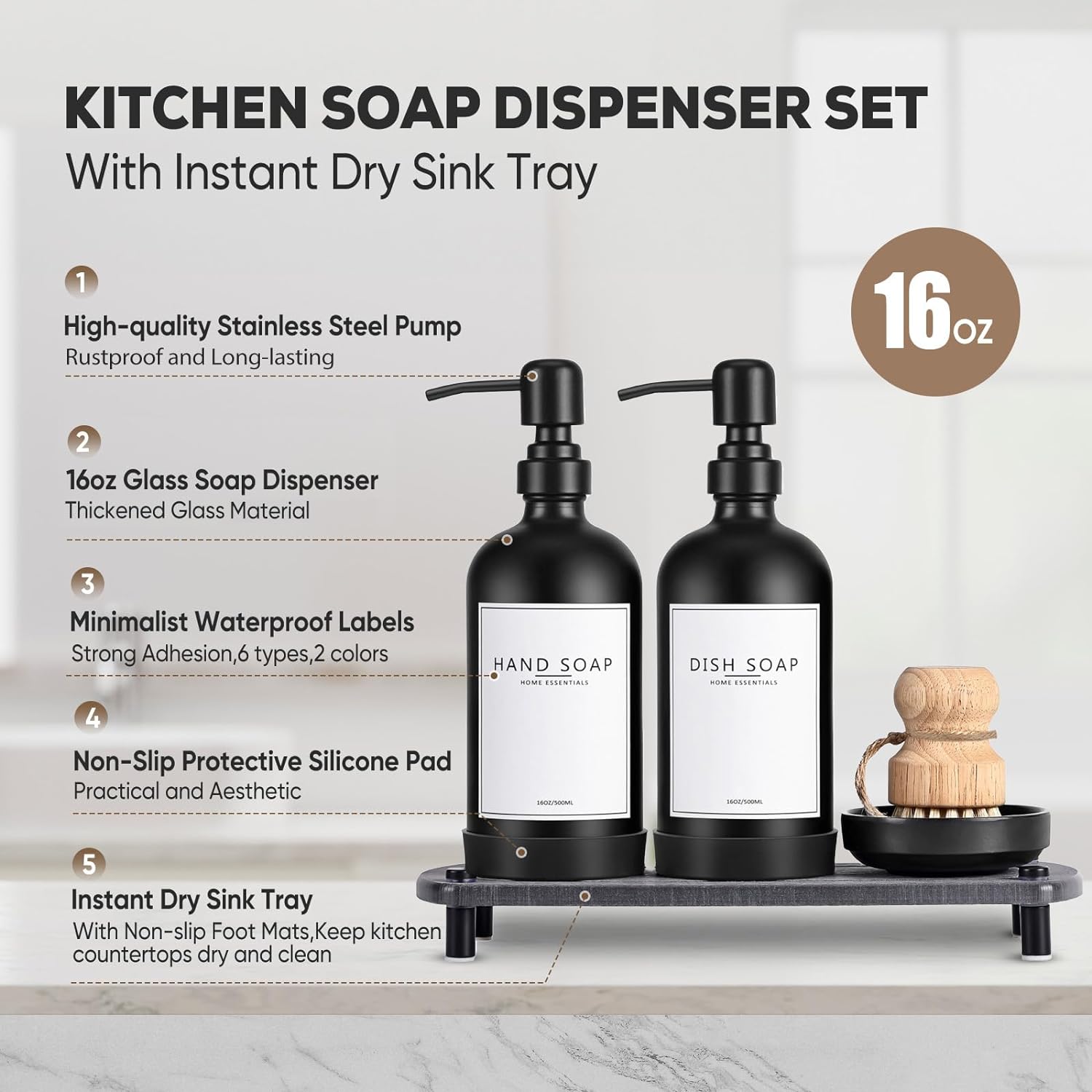 - KITCHEN SOAP DISPENSER SET INCLUDES:2Pcs black glass soap dispenser with black stainless steel pump for kitchen sink,a instant stone drying sink tray,a Bamboo dish brush with tray,12pcs waterproof labels,2pcs non-slip silicone pads&foldable funnel.Both practical and elegant, the luxury soap dispenser set is the perfect kitchen and bathroom counter decor