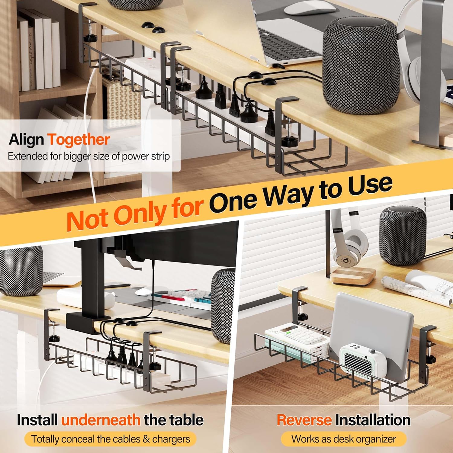 - 👍【Unique-designed Management】The wire management trays has two opening sides, which makes set up power strips more convenient and no need to unplug before install. Our wire organizer can be mounted inward or outward of your desk as required. And will excellent fit in either narrow edge desk or desks against the walls. Great solution of collecting and organizing wires.