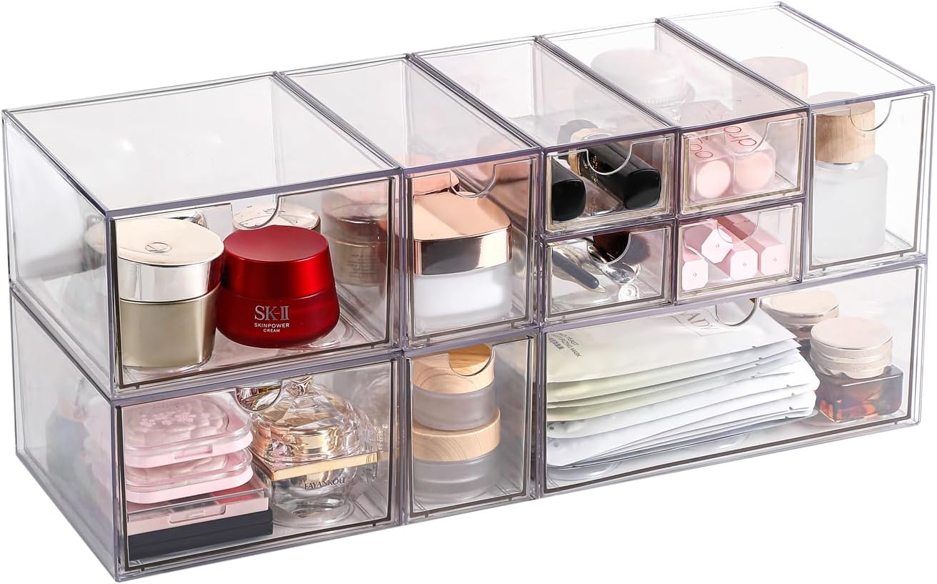 - CLEAR AND BEAUTIFUL ORGANIZER DRAWERS STORAGE :Our products are suitable for most dressing tables, desks, bathroom vanities and countertops. When used as cosmetic storage boxes, they are suitable for various sizes of blush, lipstick, eye shadow, eyeliner, foundation, makeup remover, nail polish, etc., and can also be used to store A wide range of jewelry, sunglasses, personal accessories, beauty tools, crafts and more. This drawer organizer can also hold all office supplies accessories such as pens, paper clips, pencils, markers, rulers, erasers, scissors and more.