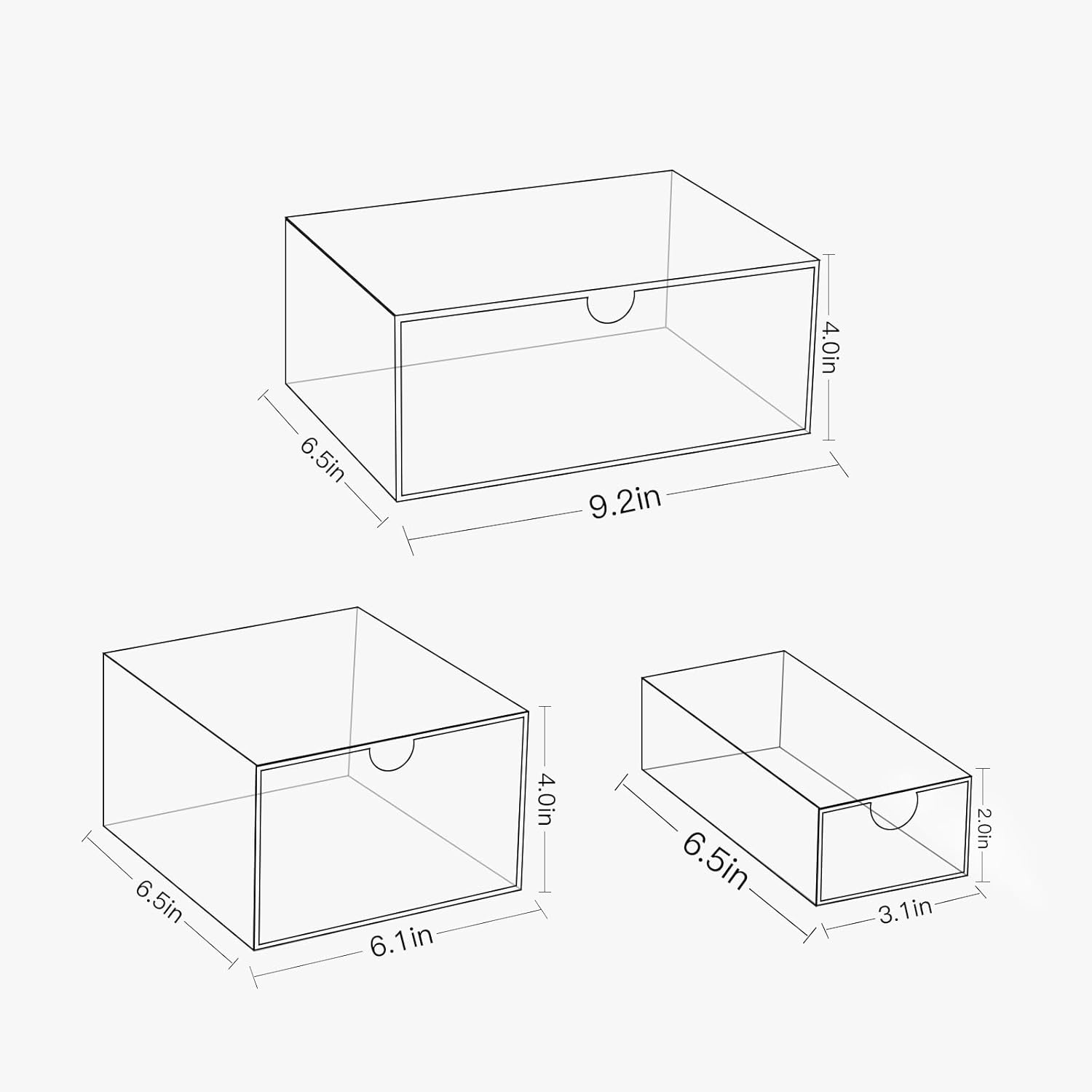 - MULTIFUNCTIONAL ACRYLIC ORGANIZER SIZE: A Set Consists Of 4 Boxes, 1 Size (9.2*6.5*4.0 In) 1 Piece, 2 Size (6.1*6.5*4.0 In) 1 Piece, 4 Size (3.1*6.5*2.0 In) 2 Pieces.