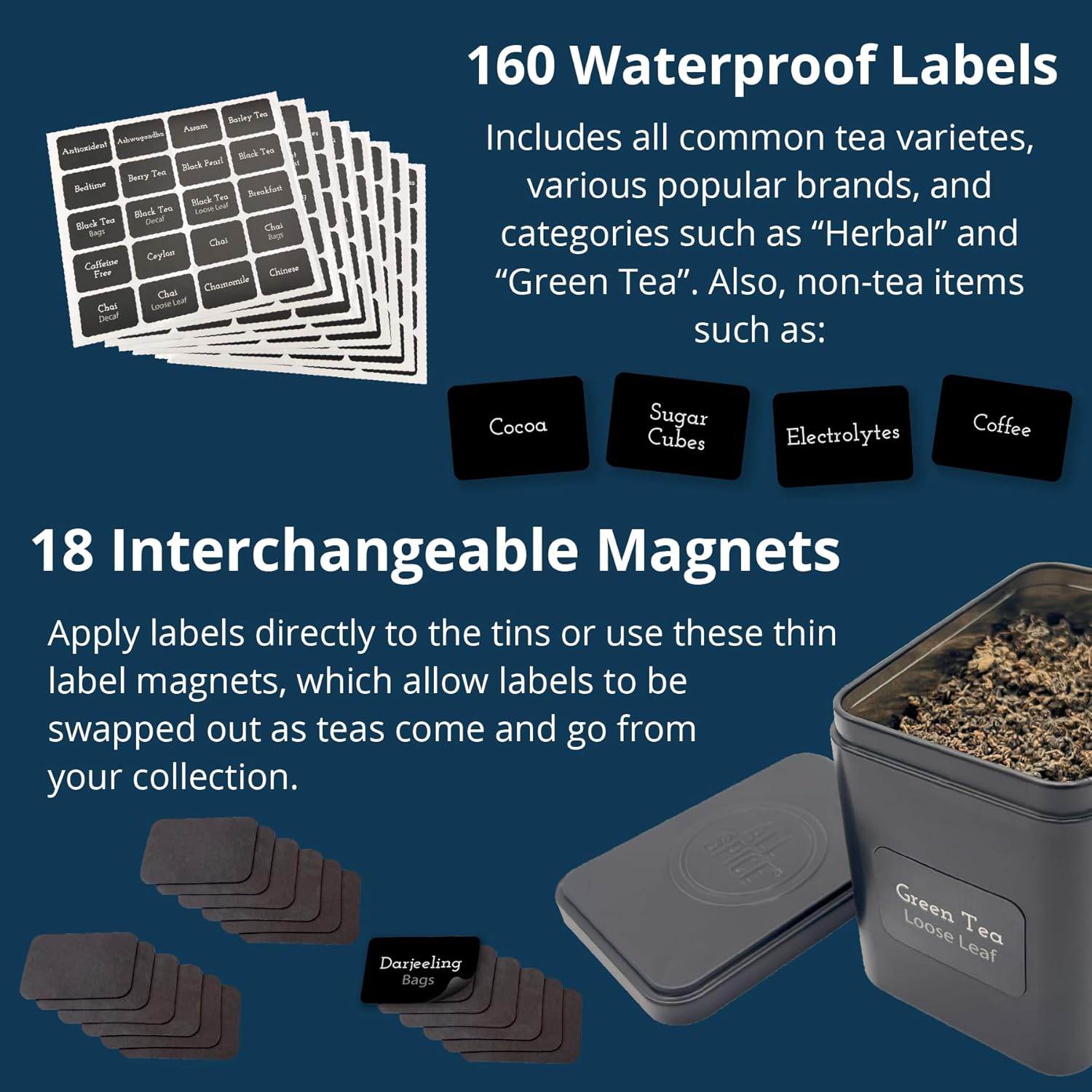 - Easy-To-Read Labels - Featuring 160 pre-printed, waterproof tea tin labels covering common and exotic teas, other drink mixes, and accessories.