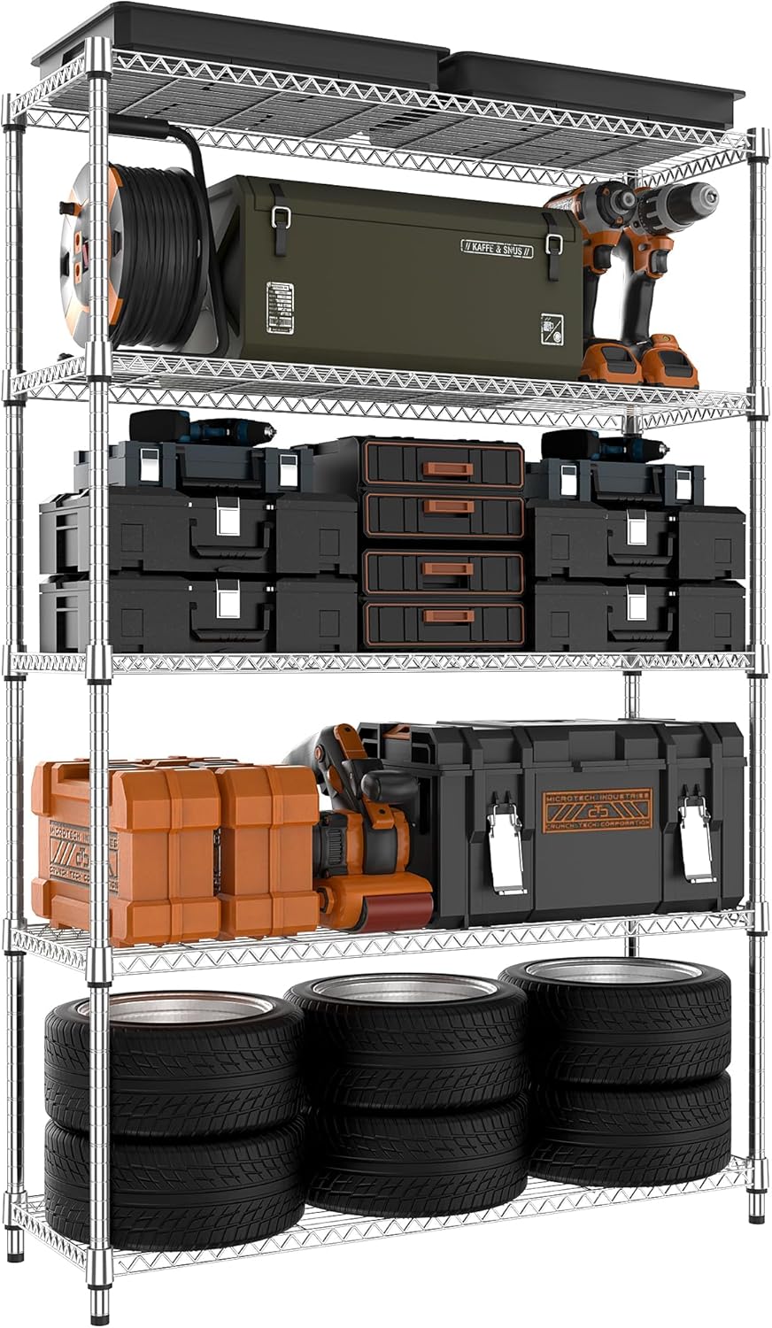 MZG 1750 lbs 5 Tier Storage Rack Metal Wire Shelving Unit, Storage Standing Household Shelf Organizer for Kitchen Pantry Closet Garage Basement Utility Room, Chrome 15.7" D x 45.3" W x 70.4" H
