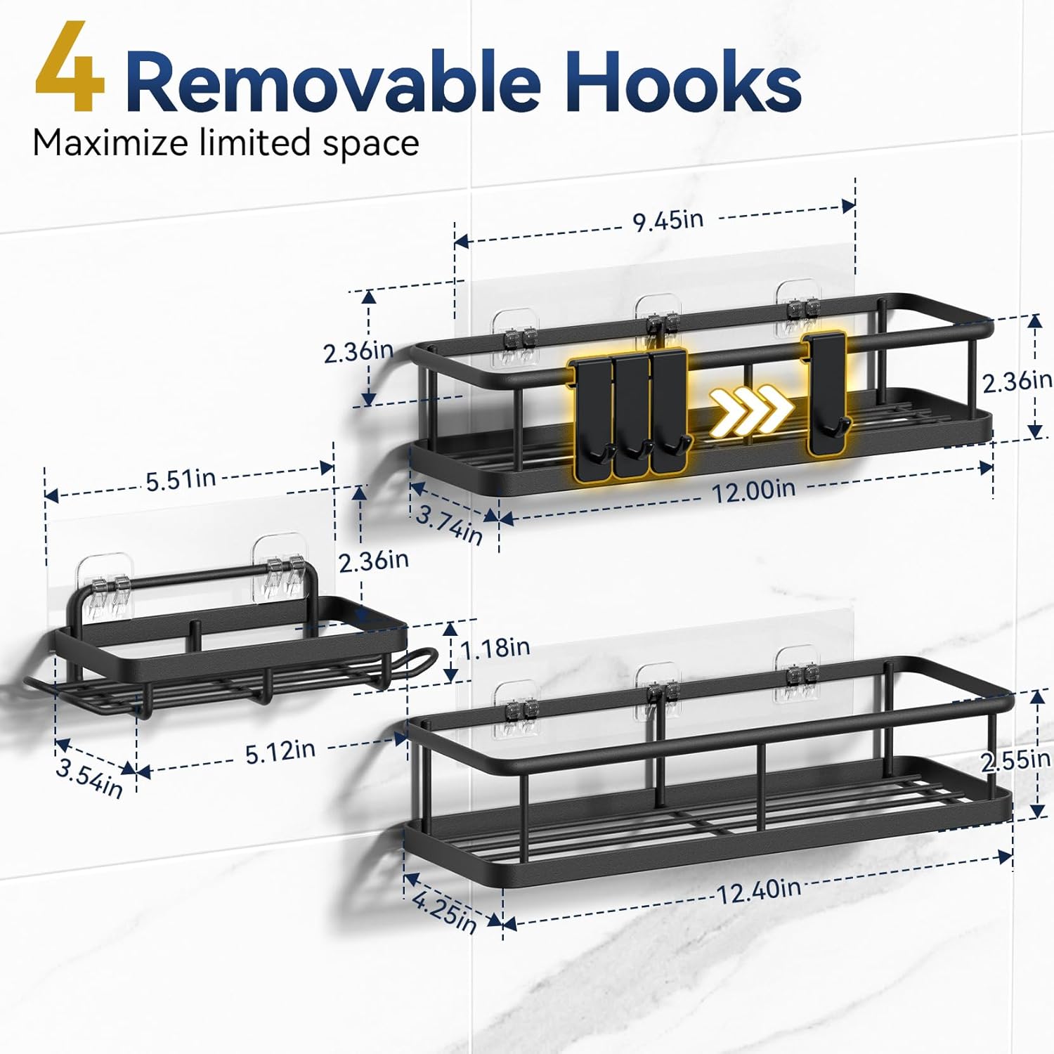 YASONIC Shower Caddy Adhesive, No Drill Bathroom Shower Organizers, with Removable Hooks and Soap Holder, Rust Proof Shower Shelves, Wall-Mounted Shower Holder, 3 Pack, Black