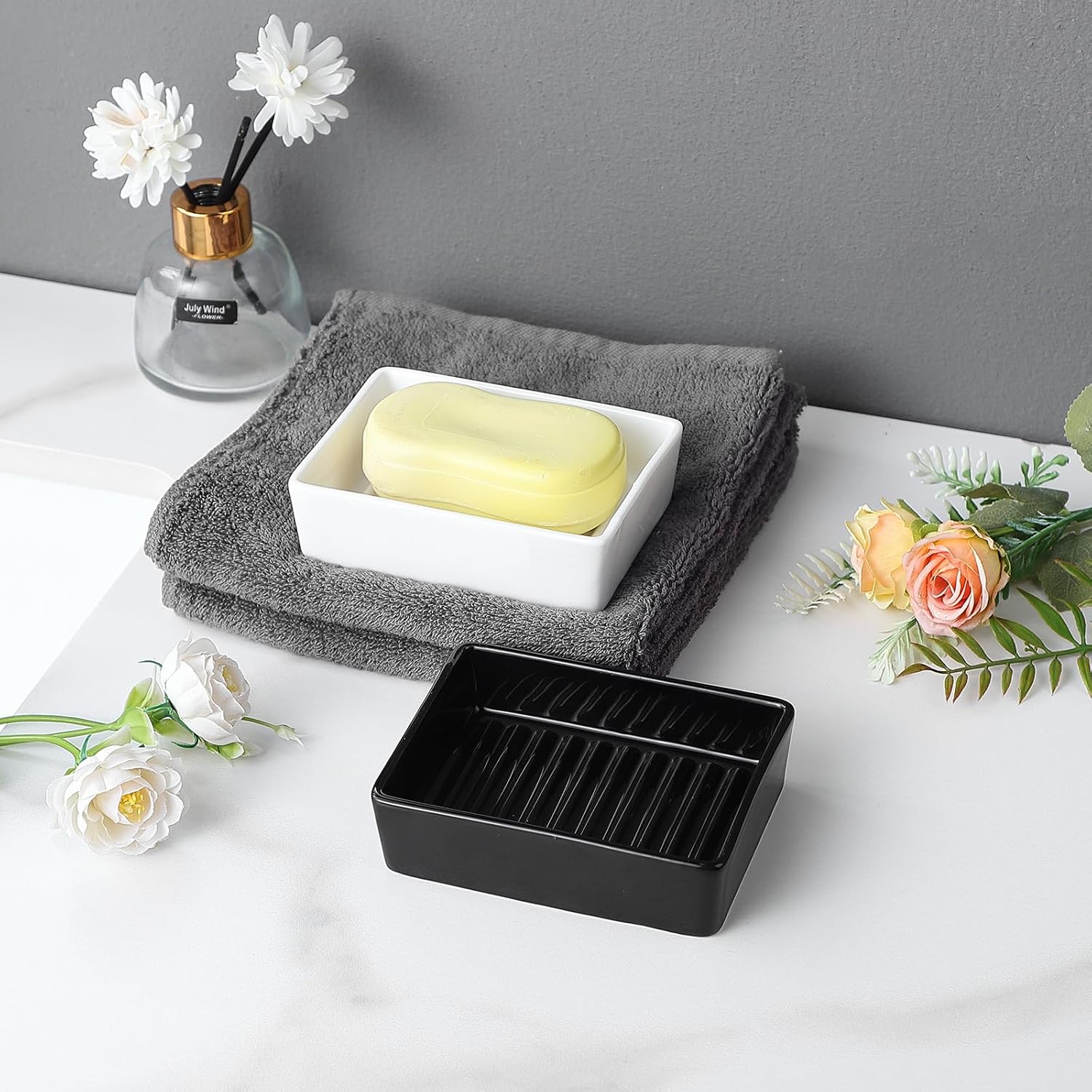 - 【Modern】Eyrozia ceramic soap dish boasts a sleek and contemporary design, featuring rounded edges that elegantly hold rectangular soap. Its chic addition to any bathroom or kitchen decor effortlessly complements any color theme, adding a touch of contemporary charm.