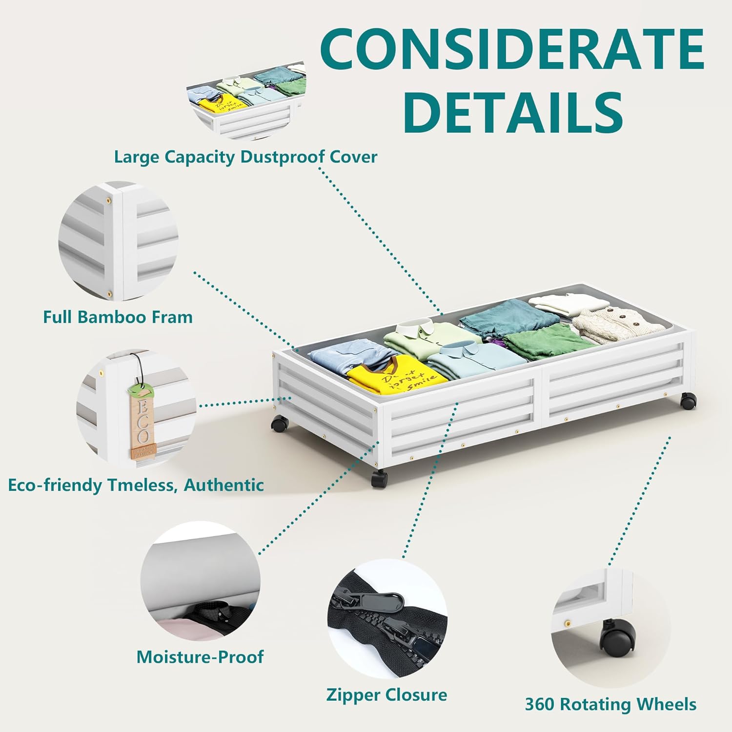 - Sturdy and Durable: Our underbed storage units are built to last with high-quality 100% Real Bamboo, ensuring withstand the test of time,boasting 4 rotating wheels with capacity of 120lbs. With 48L large capacity dustproof cover bags are designed to store seasonal clothes, bedding, and household items. It's a versatile storage solution that can be customized based on your needs.