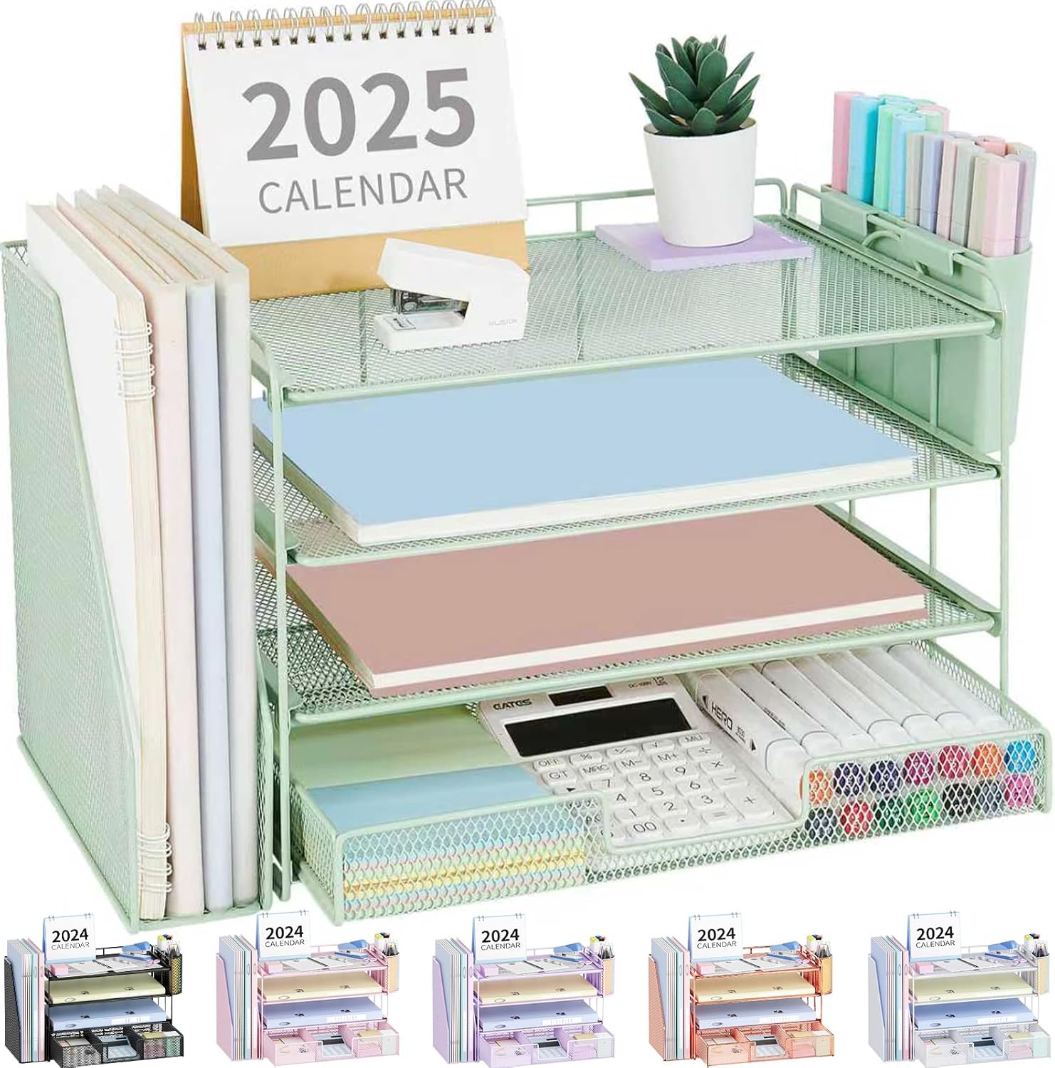 Desk Organizer and Accessories, 4-Tier Desktop File Organizer with Drawer and 2 Pen Holders, Office Desk Accessories, File Sorters, Workspace Organizers for Office Supplies(Green)