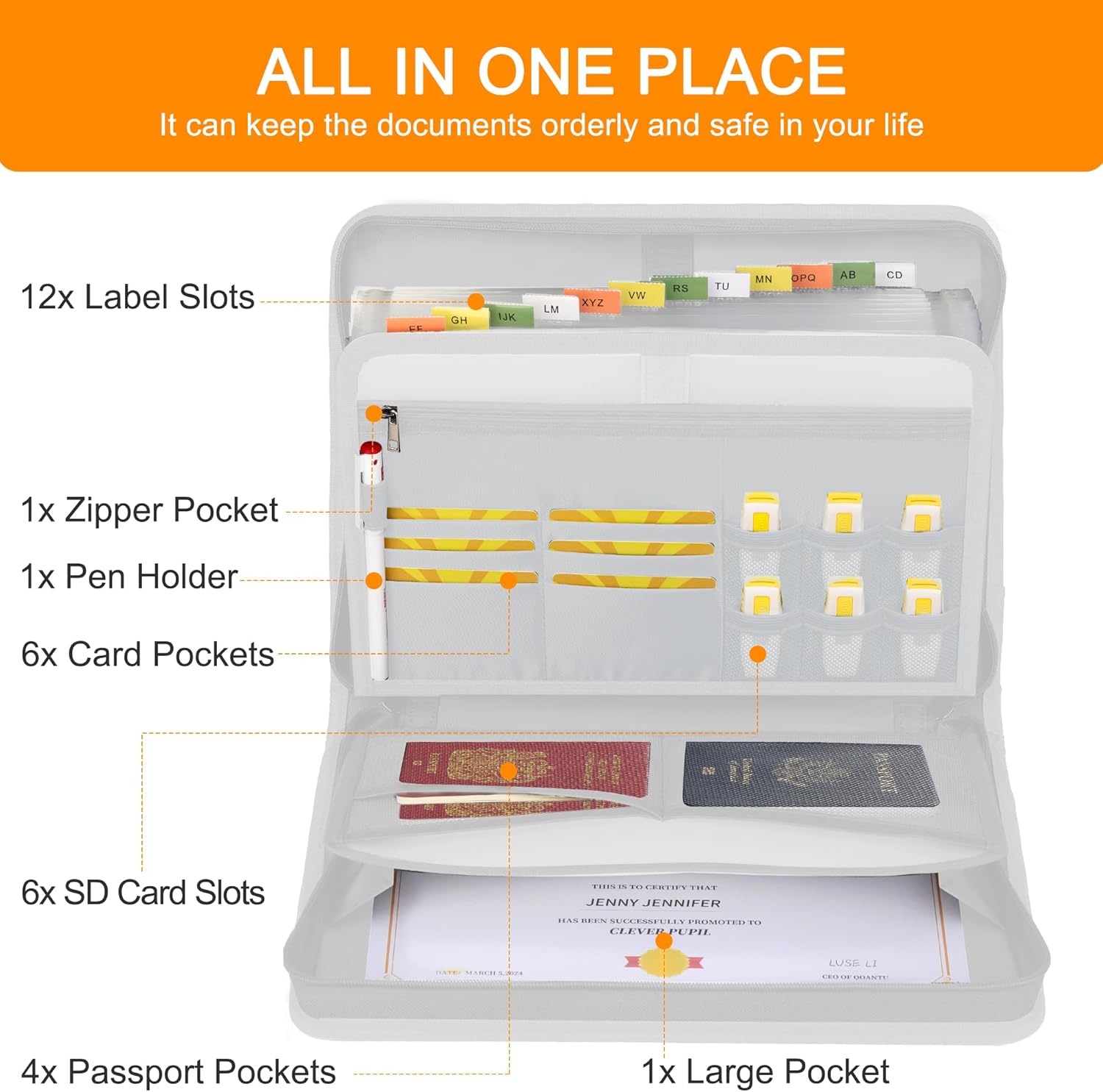 - KEEPING DOCUMENTS SAFE AND ORDERLY:It is large enough to store your important documents without wrinkling . Expanding file organizer comes with multiple compartments to store various types of documents such as birth certificates, passports,bank card ,U dish, land and property titles, latest tax filing, diplomas etc.The inner pen holder is used to fix the pen in place. When we write a document or sign a contract, we can find it quickly