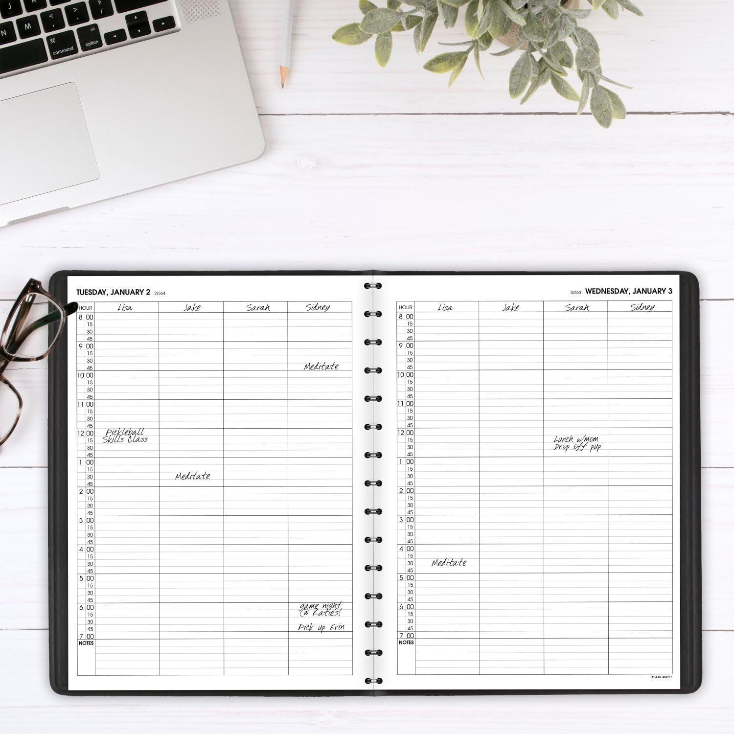 - FOUR PERSON DAILY LAYOUT – One day per page spread has four ruled columns for side-by-side planning. Quarter-hourly appointment times run 7:00 a.m. — 8:00 p.m. on weekdays and 7:00 a.m. — 6:00 p.m. on Saturday. Pages measure 8" x 11".