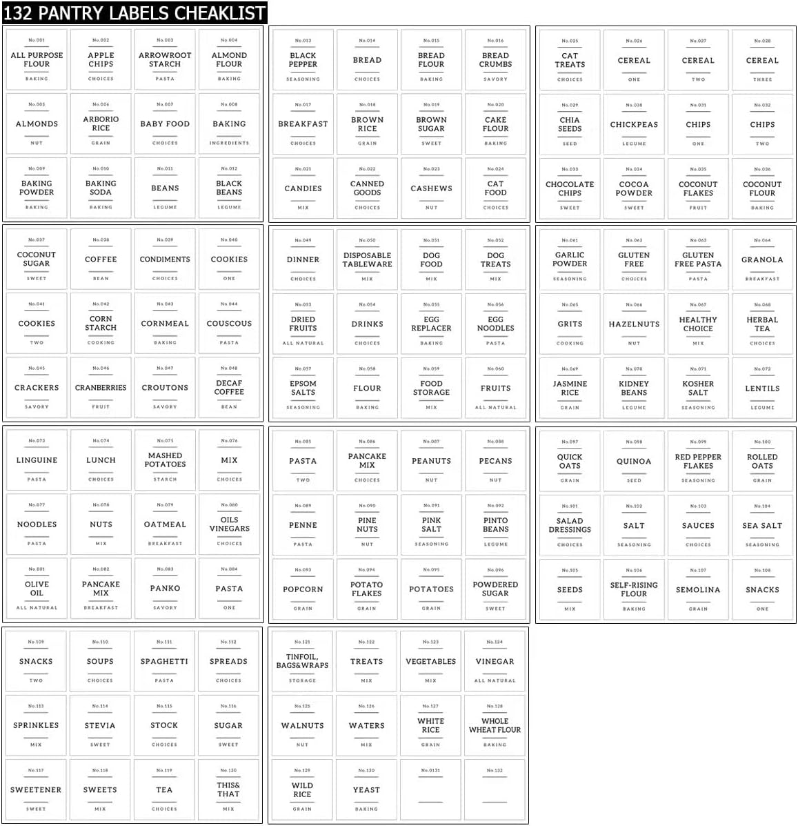 - 【PERFECT FOR PANTRY】132 Kitchen pantry labels for spaghetti container storage to keep your food fresh and pantry tidy. Minimalist labels are black text on white food labels stickers suitable for all airtight glass cereal containers storage. Pantry decal organization labels are preprinted on premium waterproof vinyl stickers that won't tear or peel off but can easily be removed.