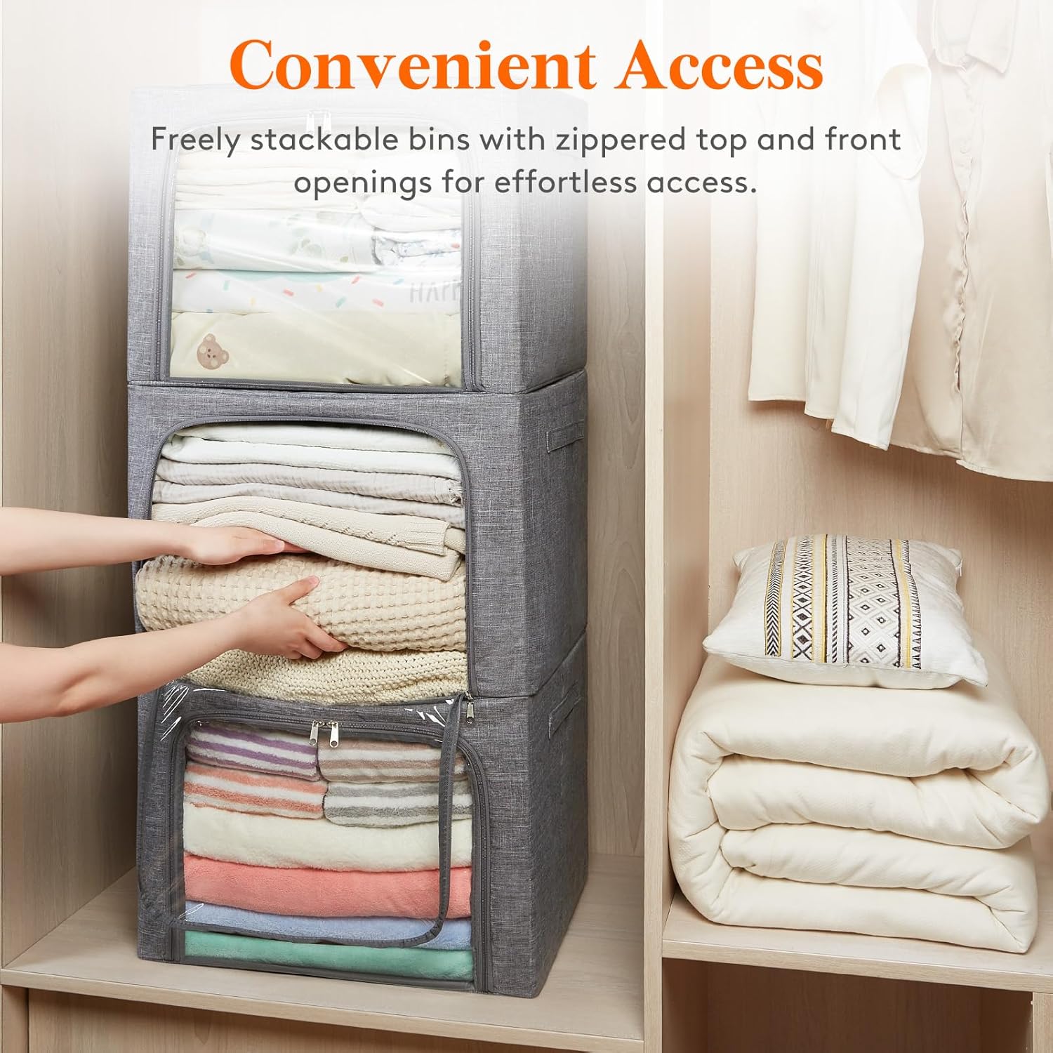 - Convenient Access: This clothing storage has a zippered top and front opening, allowing for easy and hassle-free organization. Transparent windows on the front and sides provide a clear view of the contents. When stacked, clothes can be directly accessed from the bottom box through the front window, eliminating the need to remove boxes above.