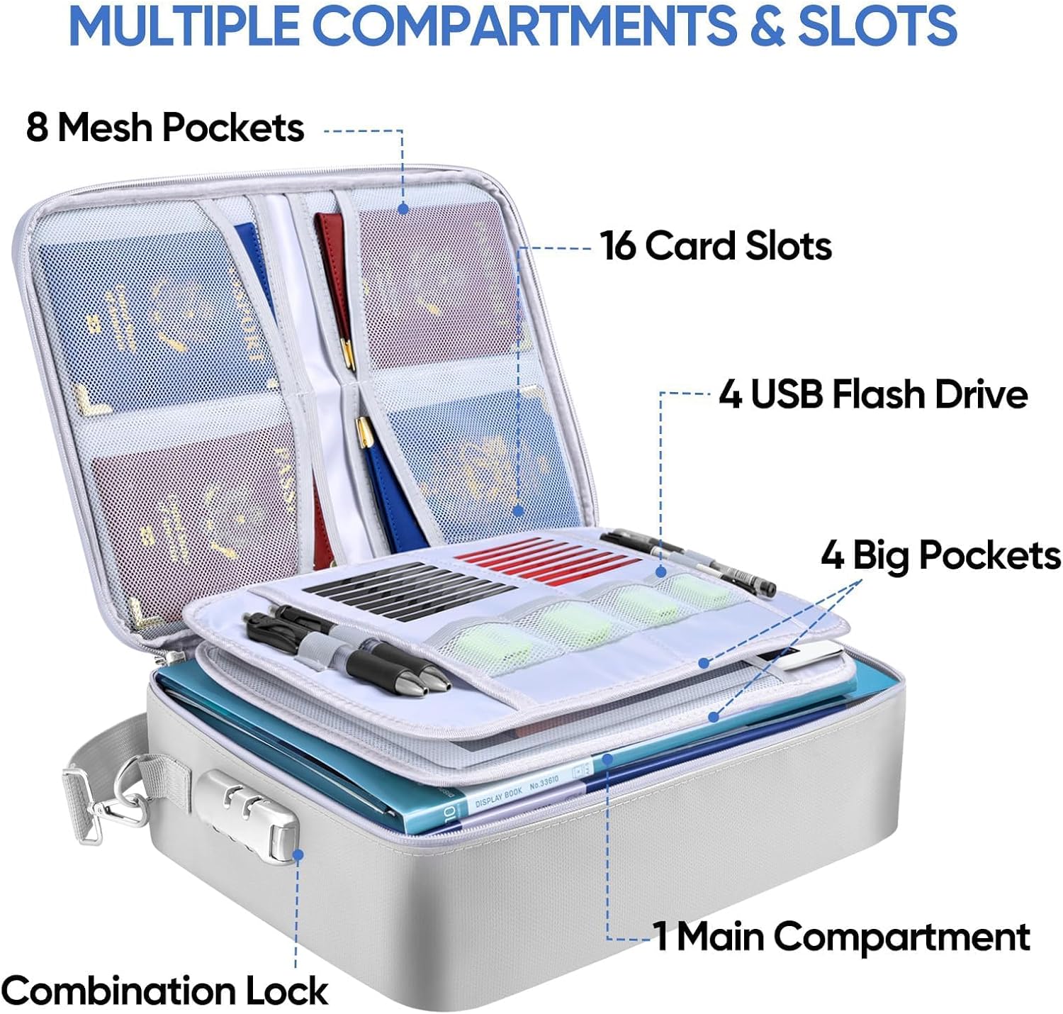 - Large Capacity: The document bag (15''x11''x4'') features a three-layer design and includes 12 different sizes of mesh compartments, 16 card slots, 4 U Disk pockets, and one spacious main pocket. Elastic straps keep items neatly in place, keeping everything remains organized