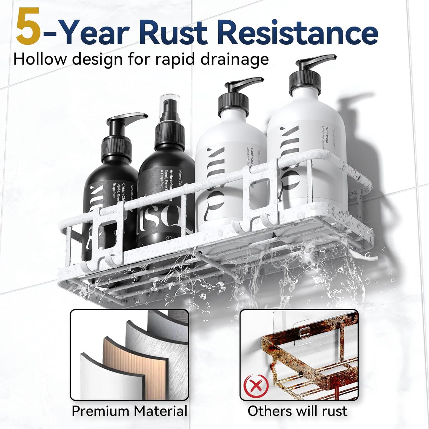 - 【Durable Metal, Hollow Drain Design】The bathroom shower organizer is made of high quality metal and high temperature paint technology, which is durable, rust resistant, waterproof, and scratch resistant. Can stay with you for up to 6 years. Hollow design at the bottom, good ventilation and drainage, convenient cleaning. Keep shelves and bathroom necessities dry;