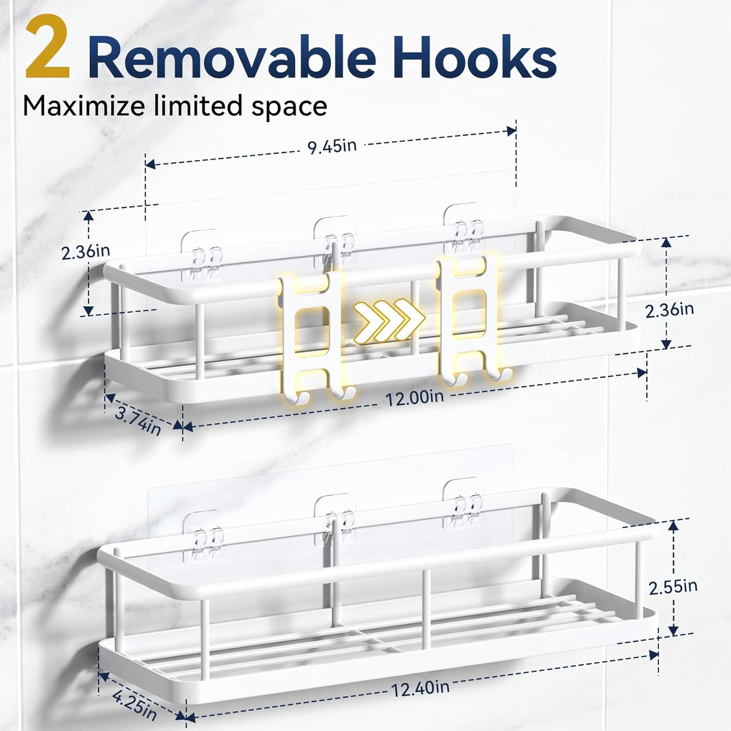 YASONIC Shower Caddy Adhesive, No Drill Bathroom Shower Organizers, with Removable Hooks, Rust Proof Shower Shelves, Wall-Mounted Shower Holder, White, 2 Pack