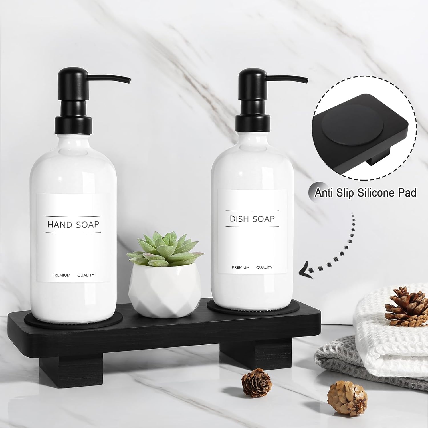 - 【Kitchen Sink Soap Dispenser Set with Tray】The dish soap dispenser set includes 2 pcs white soap dispenser with 6 waterproof labels, an white vase with artificial flowers, a wood riser tray, and 2 pcs Non-Slip silicone pads. If you're looking for a kitchen sink soap dispenser set to enhance the look and feel of your kitchen or bathroom, here it is.