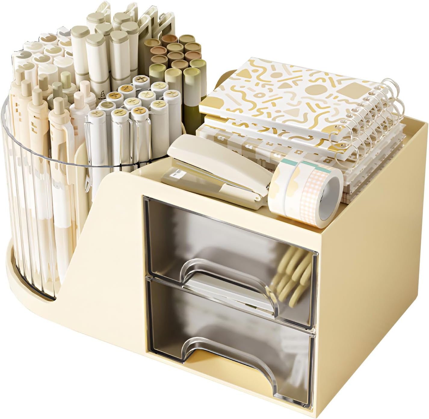 - Rotating Desktop Pen Holder: This desktop organizers consists of two parts, a 5 slots pen holder and a storage box with 2 small drawers.The 5 slots pen holder can rotate 360 degree to the left and right. You can rotate it to any angle to easily store or take out the things you want.