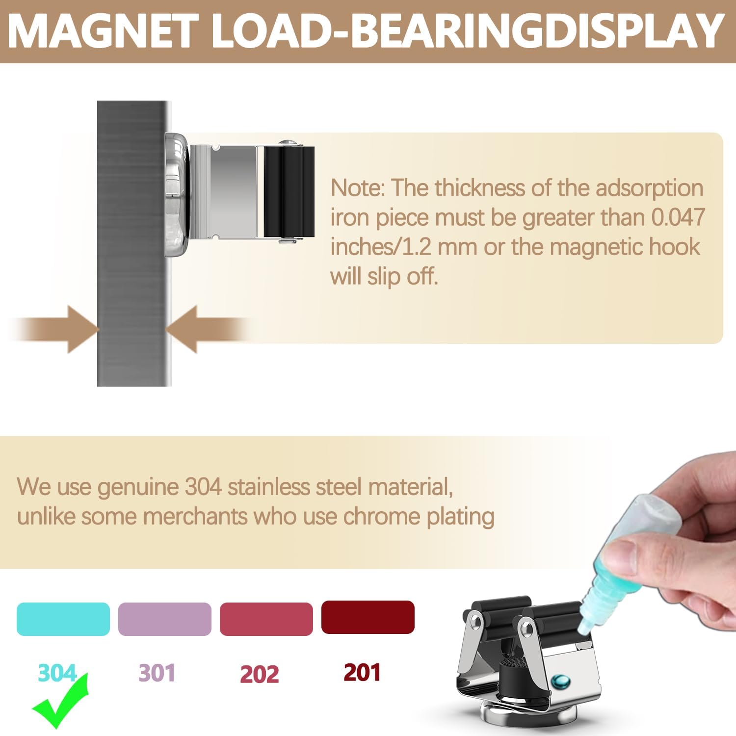 - 🧲[PREMIUM QUALITY] It comes with 4 strong magnetic broom hanger and 4 magnetic hooks.For the broom holder wall mount with Anti-Rust stainless steel and the grip of the abrasion-resistant silicone grip keeps broom and dustpan,tools,shovels very well, mop and broom holder wall mount won't fall off easily last for years,for the magnetic hooks you can easily stick to the surface of refrigerator, iron door, iron filing cabinet