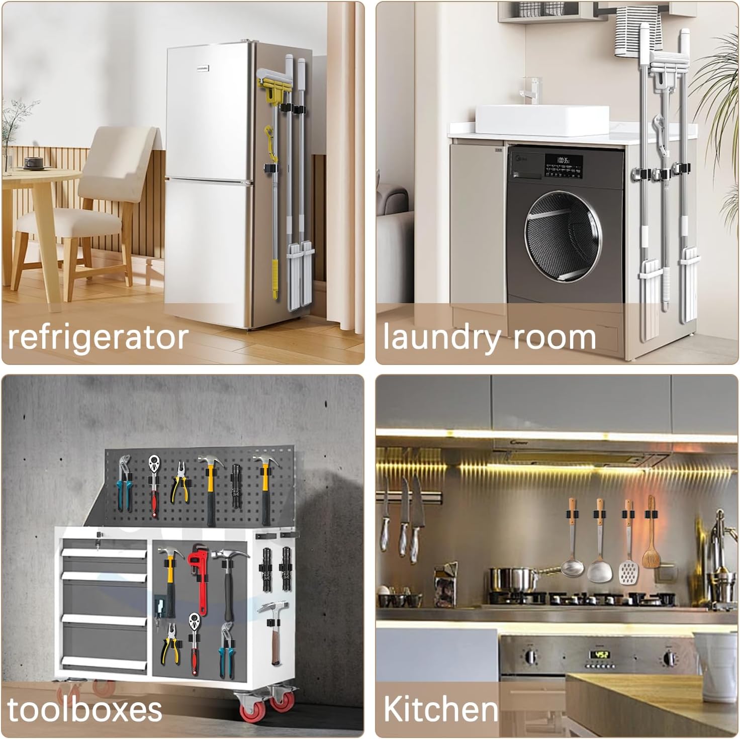 - 🧲[EASY TO INSTALL] Without drilling holes, the magnetic broom holder can attach to any metallic surface to secure mops, brooms, flashlights, spray cans, markers, and other small garage tools in place, and easily move it around when using, much handy for daily life.