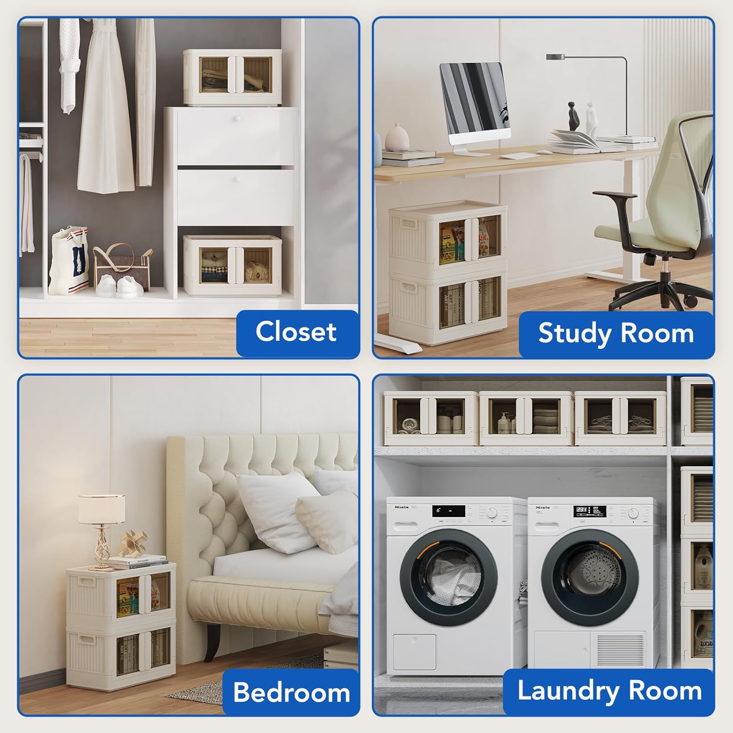 FLEXIMOUNTS 110 QT Stackable Storage Bins With Lids, Collapsible Plastic Storage Bins With Doors and Built-in Wheels For Home Dorm Closet Organizers and Storage, 3 Pack Cubes, Milky White