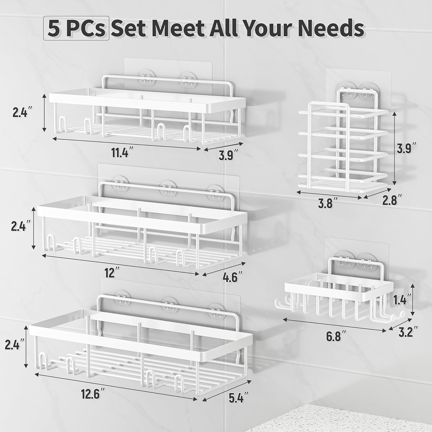 5 Pack Shower Caddy Organizer Rack Shelf for Inside Shower, Self Adhesive Wall Storage Basket Rustproof Stainless Steel Shampoo Holder Bathroom Accessory Decor Set, White