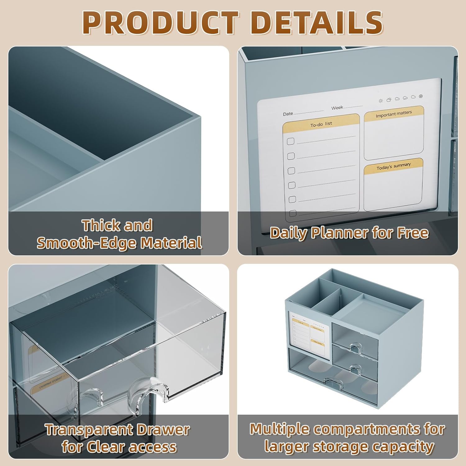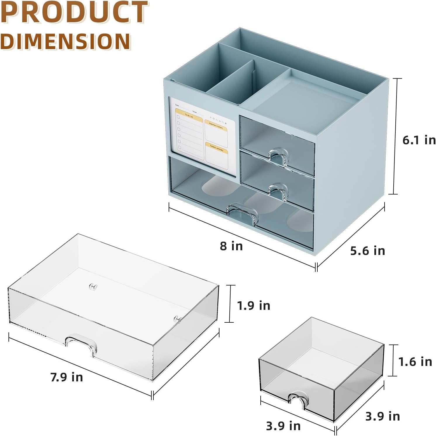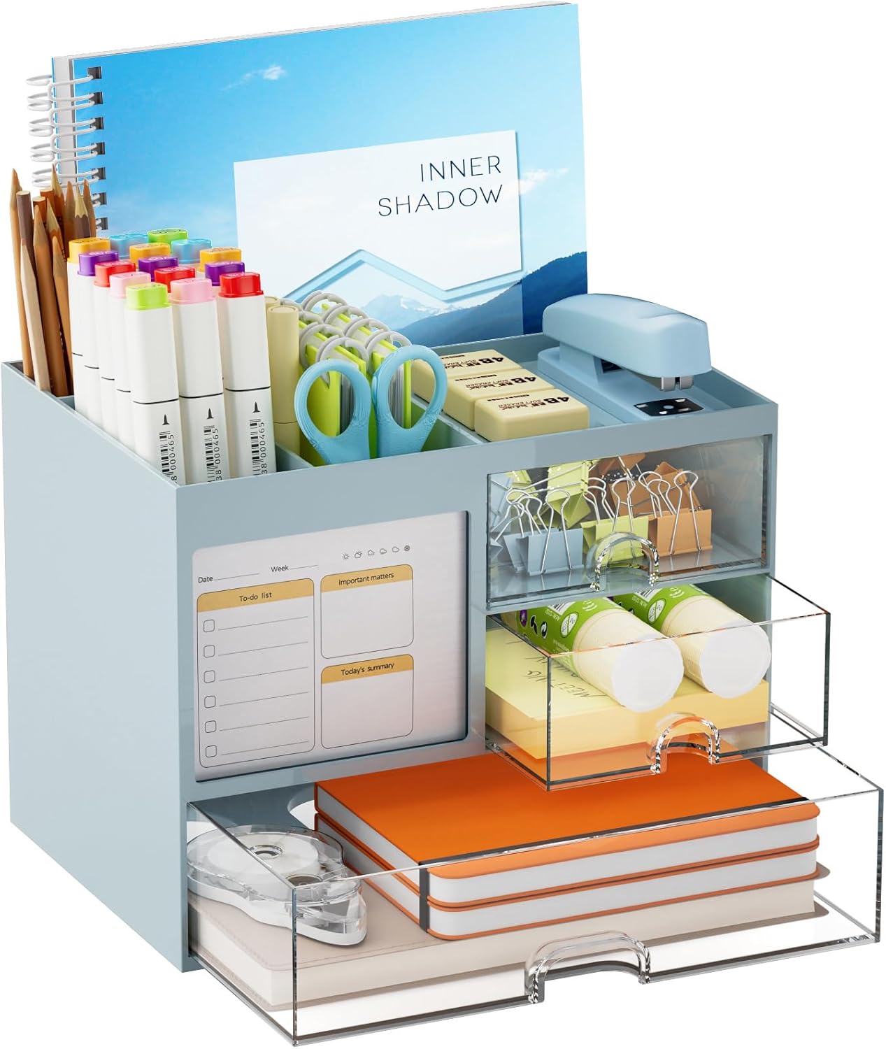 Marbrasse Desk Organizer with 3 Drawer, Multi-Functional Pencil Pen Holder for Desk, Desktop Organizer Storage for Office Home Art Supplies (Blue)