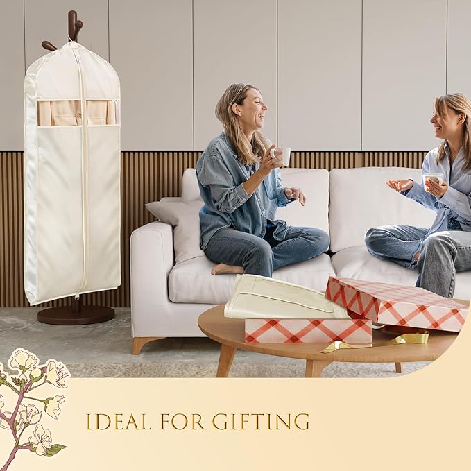Univivi Super Soft Satin Garment Bags for Hanging Clothes, 60 Inch Zippered Dress Cover with Gussets, Breathable & Non-smell for Dresses, Coats, Jackets, Shirts, 2 Pack - Apricot