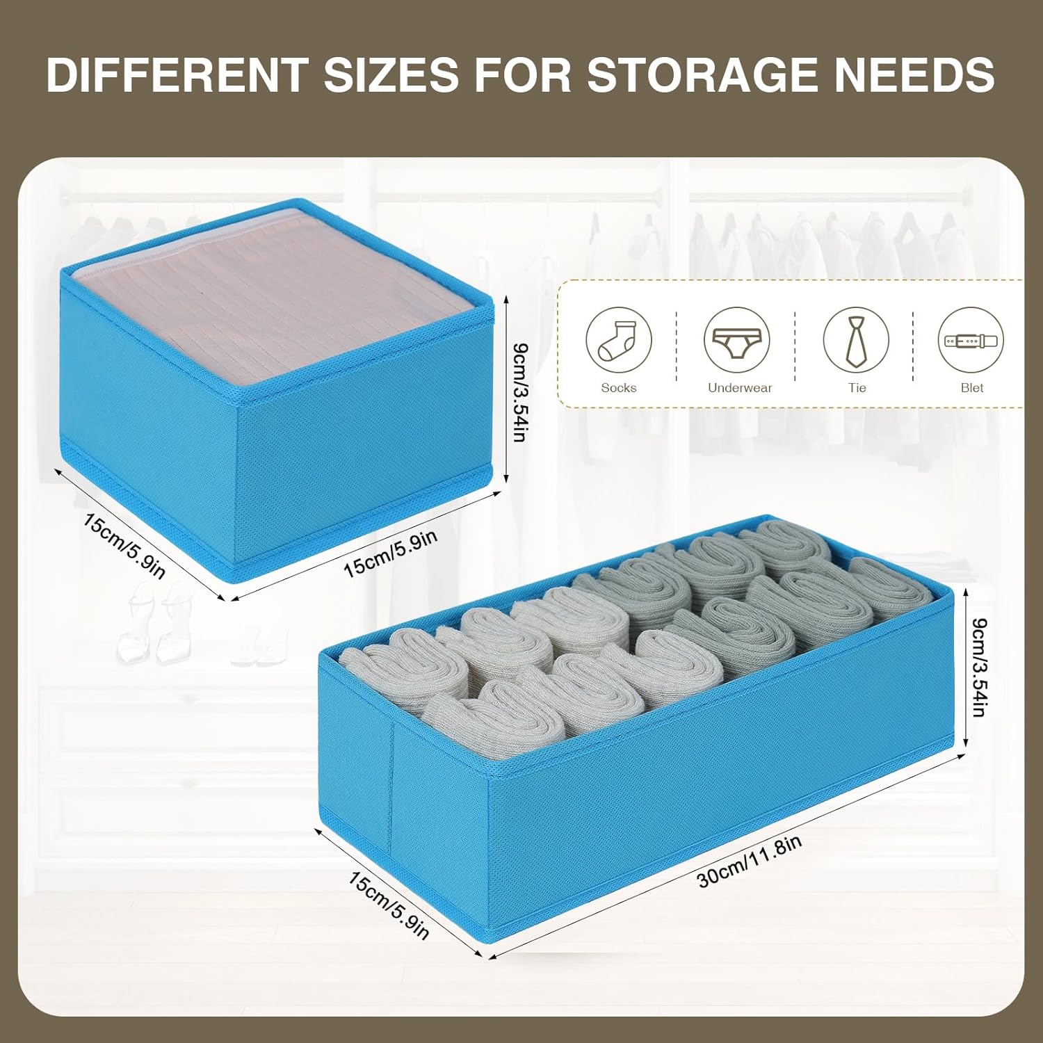 - [Multi-Size Organizer] The dresser organizers and storage choose 2 different sizes to match, you can store a variety of items, greatly improve your daily use. Medium underwear storage is 30*15*9cm (11.8*5.9*3.54") and small organizer drawers is 15*15*9cm (5.9*5.9*3.54")