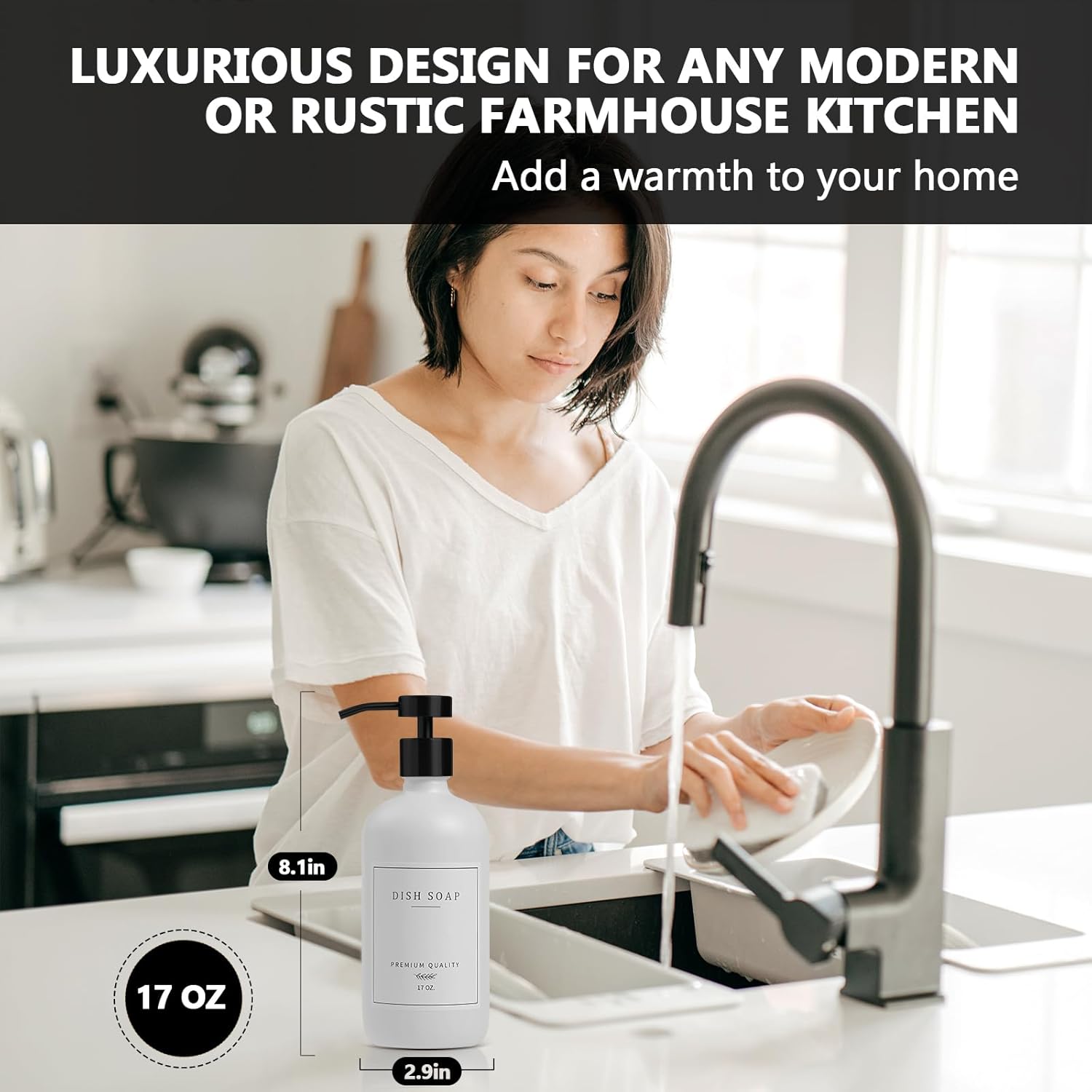 - COMFORTABLE AND DURABLE: Our dish soap dispenser for kitchen use the well-designed corrosion-resistant soap dispenser pump is not only beautiful, but also resistant to daily wear and tear, and every press is smooth and natural and releases the right amount of soap, avoiding waste, reducing hand fatigue, making even long cleaning jobs easy and enjoyable