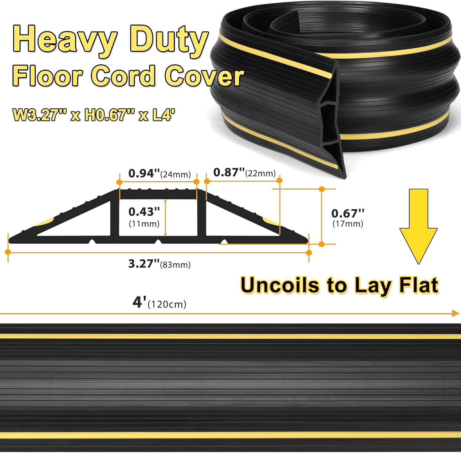 - Easy Installation: The cord cover floor comes in rolled packaging, but due to its heavy-duty design, it quickly and automatically lays flat. Just open the channels, place the wires, and you're done. Includes extra tape for your convenience if you want to reinforce the floor cord management