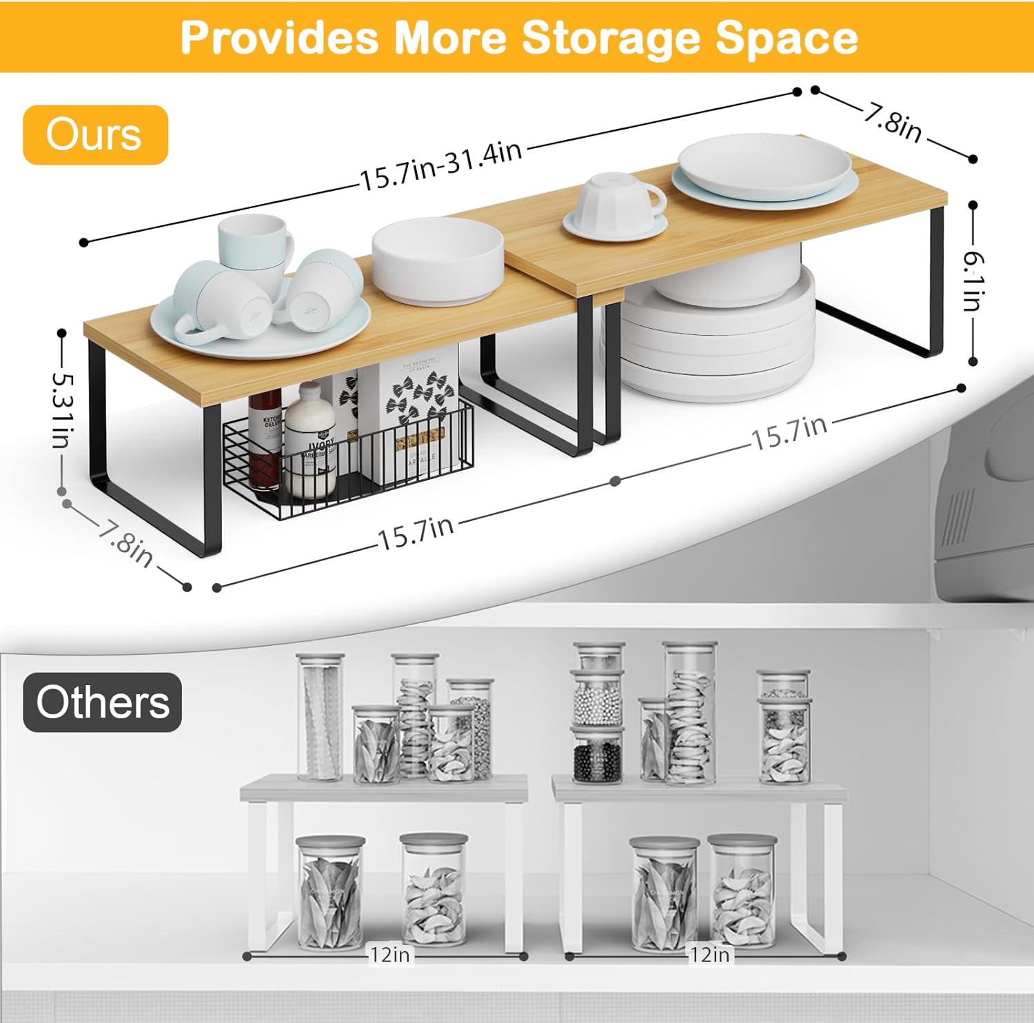 Cabinet Shelf Organizers, 15.7 inches Large Kitchen Counter Shelf, Set of 4 Wood Kitchen Pantry Organizer, Storage Shelves for Countertop, Spice Rack, Stackable, Expandable, Metal Black, Nature