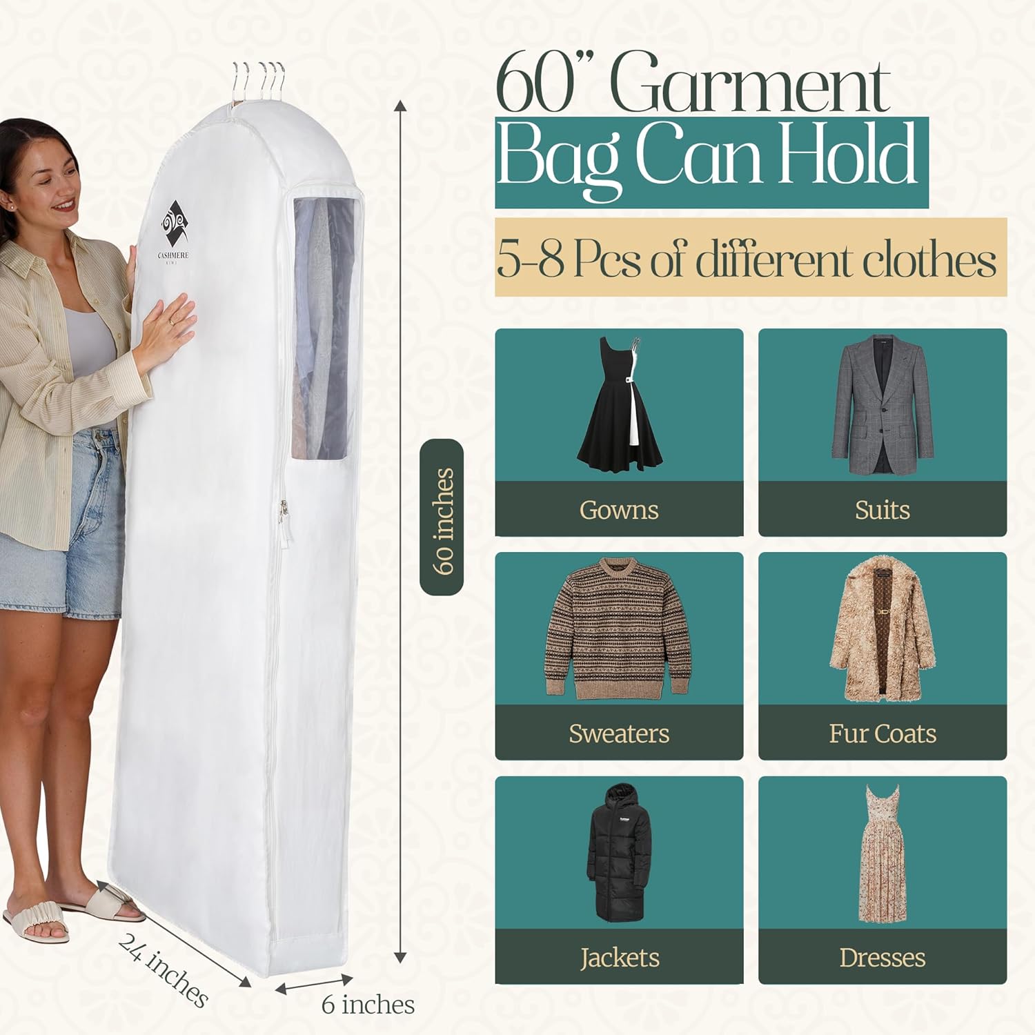 - PERFECT FOR DRESS STORAGE & CLOSET ORGANIZATION: Ideal for seasonal clothing, formal dresses, or coats, this 60-inch garment bag helps keep your closet tidy and your clothes protected. Whether you need a dress protector bag or garment bags for gowns, this versatile solution is perfect for storing and organizing your wardrobe.