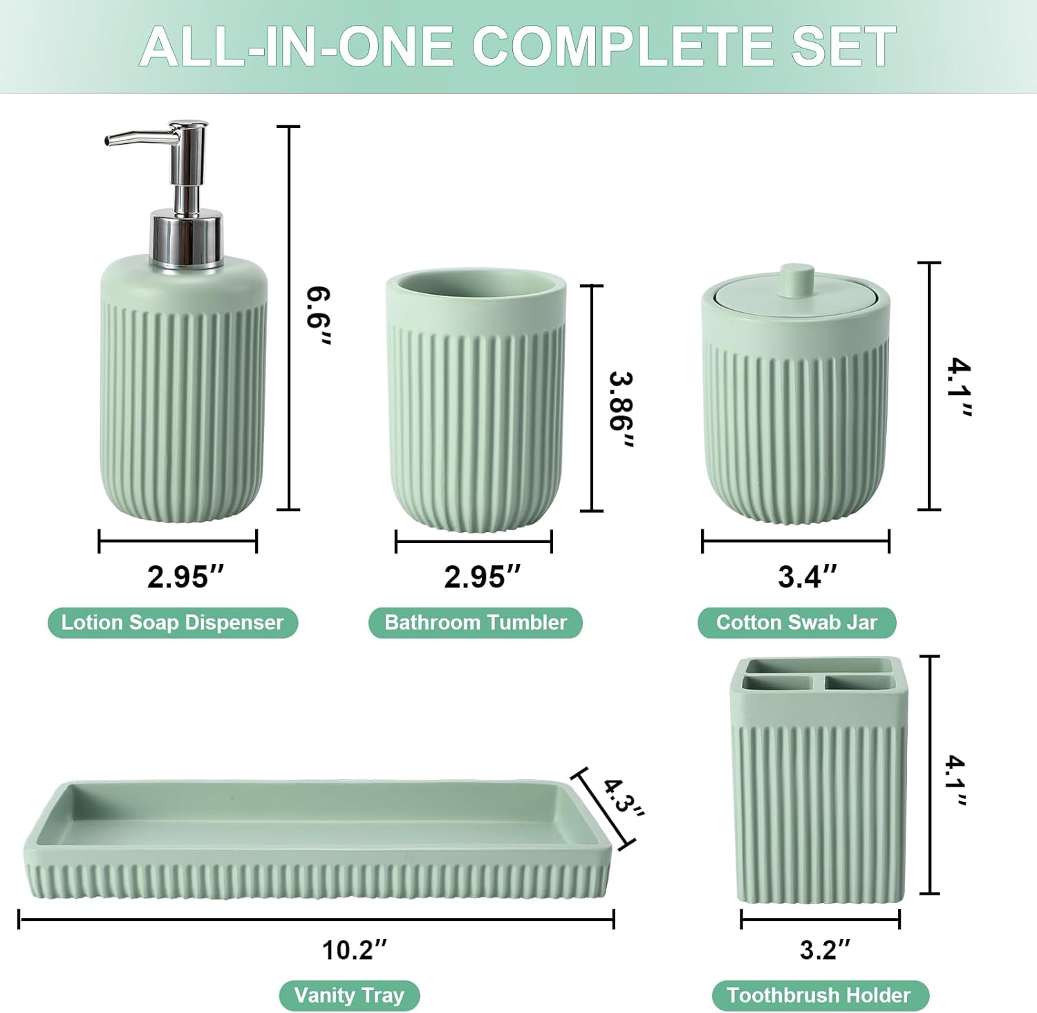 Resin Light Green Bathroom Accessories Set 5 Pcs, Lotion Soap Dispenser, Toothbrush Holder, Bathroom Tumbler, Qtip Holder and Vanity Tray, Bathroom Countertop Organizer Set for Modern Apartment